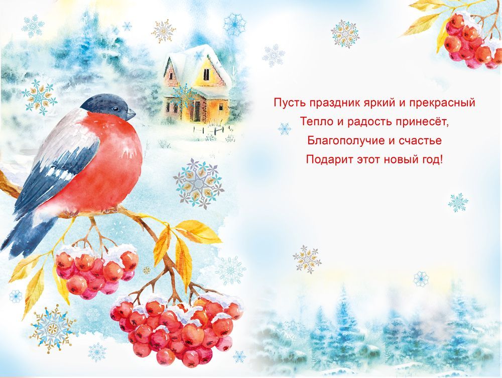 Открытка формата А5 предназначена для новогодних и зимних поздравлений в розничном и корпоративном сегментах. Изделие выполнено из плотного картона, что обеспечивает устойчивость к сгибам, сохранение формы при транспортировке и хранении, а также аккуратный внешний вид при передаче получателю. На лицевой стороне размещена полноцветная иллюстрация в акварельной стилистике: снегирь на ветке рябины на фоне зимнего пейзажа с домом и снежинками, дополненная крупной надписью «С Новым годом!». Изображение и элементы снежинок частично выделены золотой фольгой, за счёт чего создаётся чёткий визуальный акцент и повышается износостойкость отдельных декоративных деталей при трении и частом перекладывании в стопках. Внутри открытки нанесён готовый поздравительный текст, что удобно при массовой рассылке, оформлении подарочных наборов, использовании в офисах, торговых точках и сервисных компаниях; при необходимости остаётся свободное место для подписи, указания имени адресата и даты. Габаритные размеры готового изделия 182 × 122 мм обеспечивают совместимость с распространёнными почтовыми и подарочными конвертами соответствующего формата, позволяют компактно размещать продукцию на витринах и в напольных дисплеях, а также оптимизировать упаковку и транспортировку крупными партиями. В упаковке 10 одинаковых открыток, что удобно для оптовых закупок к сезону: единый дизайн облегчает планирование ассортимента, формирование серийных подарочных комплектов и равномерную выкладку в торговом зале. Открытка подходит для вручения частным лицам, клиентам и партнёрам, может использоваться как самостоятельный носитель поздравления или как дополнение к сувенирам и подарочным наборам.
