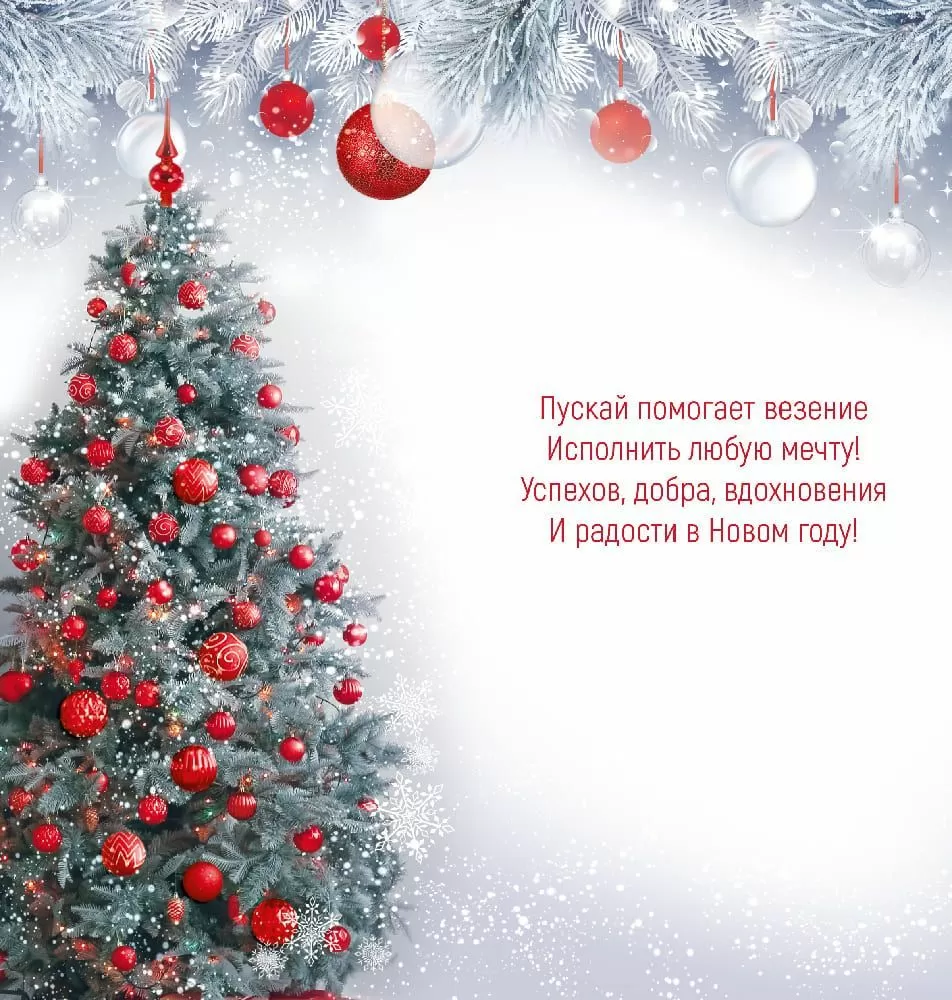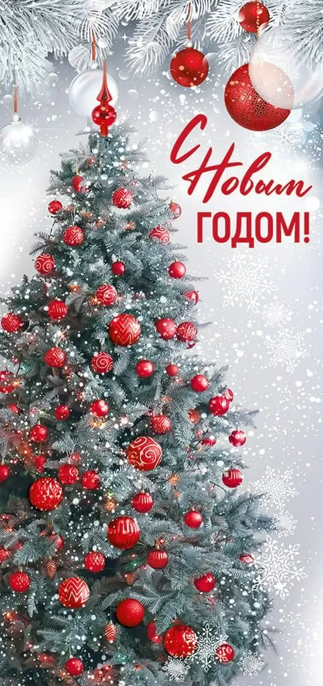 Дизайнерская открытка «С Новым Годом!» для оригинального корпоративного поздравления. Формат – евро. Материал – картон высокого качества. Важным достоинством изделия является авторский дизайн. В первую очередь внимание привлекает большая нарядная елка на светлом фоне. Елочные украшения в красных ярких оттенках добавляют изображению контраст, отчего весь дизайн выглядит динамичным и привлекательным. Россыпь снежинок усиливает новогоднюю тему. Также здесь располагается поздравительная надпись «С Новым Годом!» тоже в красном цвете. Внутри открытки есть замечательные стихи с теплыми пожеланиями.