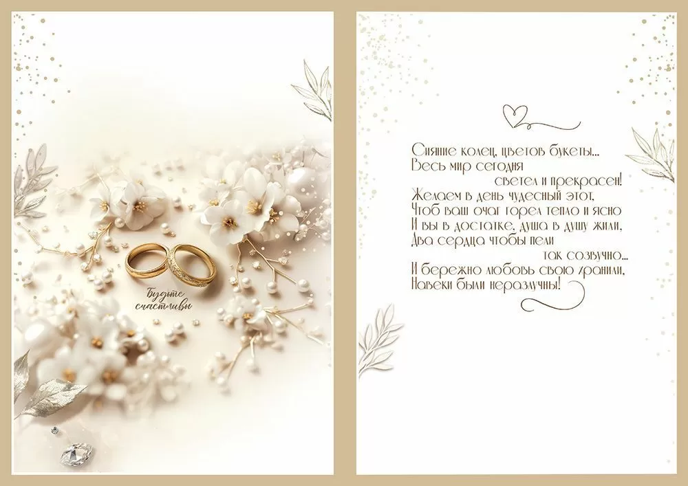 Открытка большого формата (А4) – идеальное решение для свадьбы! С размерами 196х277 мм, она прекрасно подходит для подарка молодоженам. Украшена голографическими блестками в лаке, выглядит очаровательно и привлекает внимание. Это классическое дополнение к подарку или денежному конверту. Внутри – поздравительное стихотворение, которое можно зачитать вслух. Изделие изготовлено из прочного картона, который хорошо держит форму. Открытка от производителя не помнется при транспортировке и использовании. Сверху на картонную основу нанесено четкое полноцветное изображение – нежные цветы и золотые обручальные кольца. Благодаря высокому качеству печати и защитному покрытию краски не выцветут, молодые будут видеть презент и вспоминать торжественное мероприятие еще долгие годы. На нашем сайте можно заказать открытки оптом. Количество экземпляров в одной упаковке – 10 штук.