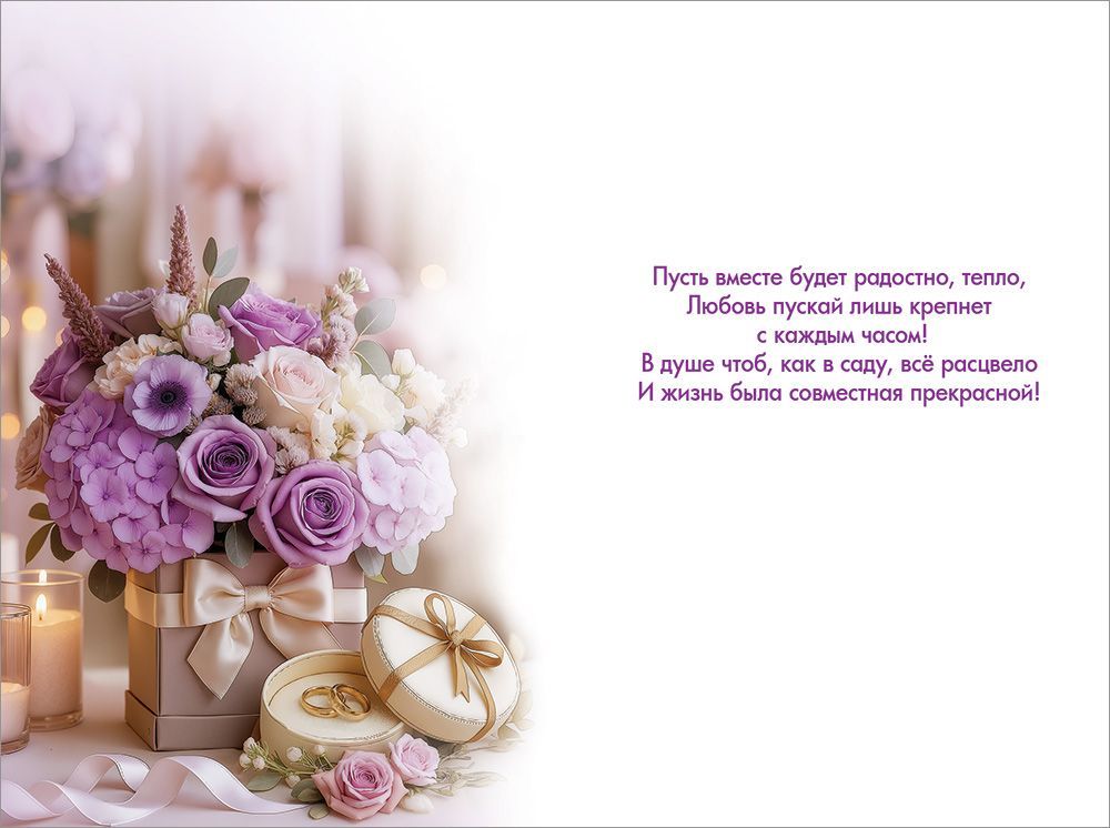 Открытка формата А5 предназначена для поздравления с днём свадьбы и ориентирована на использование в розничной продаже и оптовых поставках для магазинов подарочной и канцелярской продукции. Изделие изготовлено из плотного картона, устойчивого к изгибам и истиранию, что важно при транспортировке крупными партиями и при выкладке в торговом зале. Прямоугольный формат с размерами 182 × 122 мм удобен для стандартных витрин, напольных и настольных стоек, а также подходит под типовые почтовые конверты соответствующего размера. На лицевой стороне размещена композиция с букетом розовых и кремовых цветов в подарочной коробке, свадебными кольцами и надписью «С Днём свадьбы!», что однозначно определяет тематику и облегчает покупателю выбор поздравления под конкретный повод. Изображение двустороннее: внешняя сторона служит визуальным акцентом, внутренняя содержит заранее подготовленный поздравительный текст, позволяющий использовать открытку без дополнительного оформления либо дополнять его личными пожеланиями. Отделка выполнена с применением радужных блёсток в лаке, создающих умеренный декоративный эффект и подчёркивающих отдельные элементы композиции, при этом поверхность остаётся достаточно гладкой, что снижает риск повреждений при штабелировании и фасовке. Конструкция открытки рассчитана на многократное перелистывание без растрескивания в месте сгиба, что важно для сохранения товарного вида при демонстрации образцов. В упаковке 10 экземпляров, что удобно для формирования минимальной закупочной единицы, планирования складских остатков и равномерного распределения по торговым точкам. Открытка подходит для дарения как самостоятельный элемент поздравления или в дополнение к подарку, гармонично сочетается с традиционными свадебными аксессуарами в пастельной гамме и может использоваться в качестве декоративного элемента в зоне вручения подарков или фотозоне.