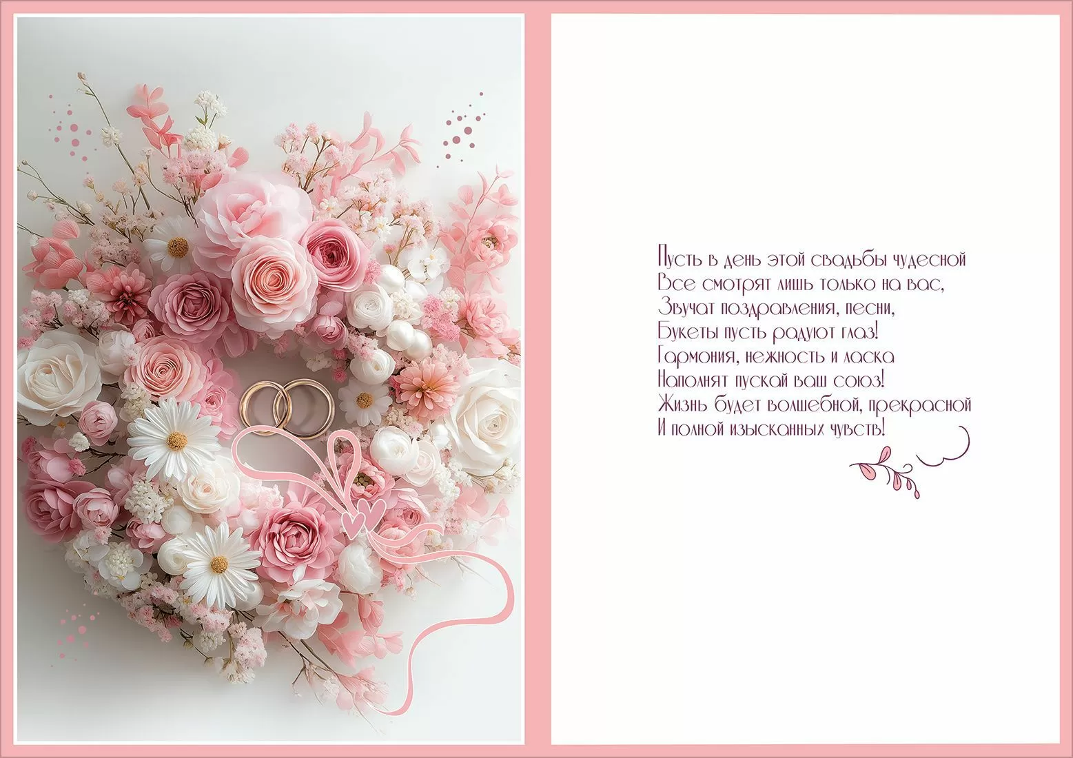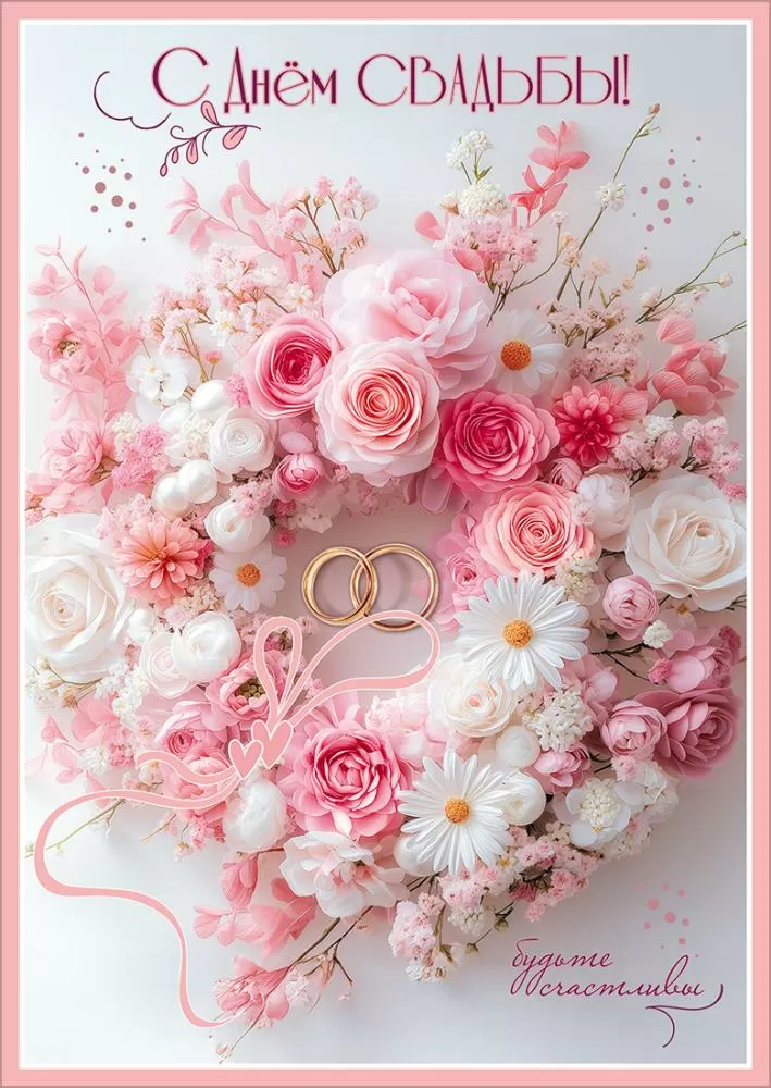 Открытка «С Днём Свадьбы!» (венок из разных розовых и белых цветов, кольца, ленточка, сердечки)