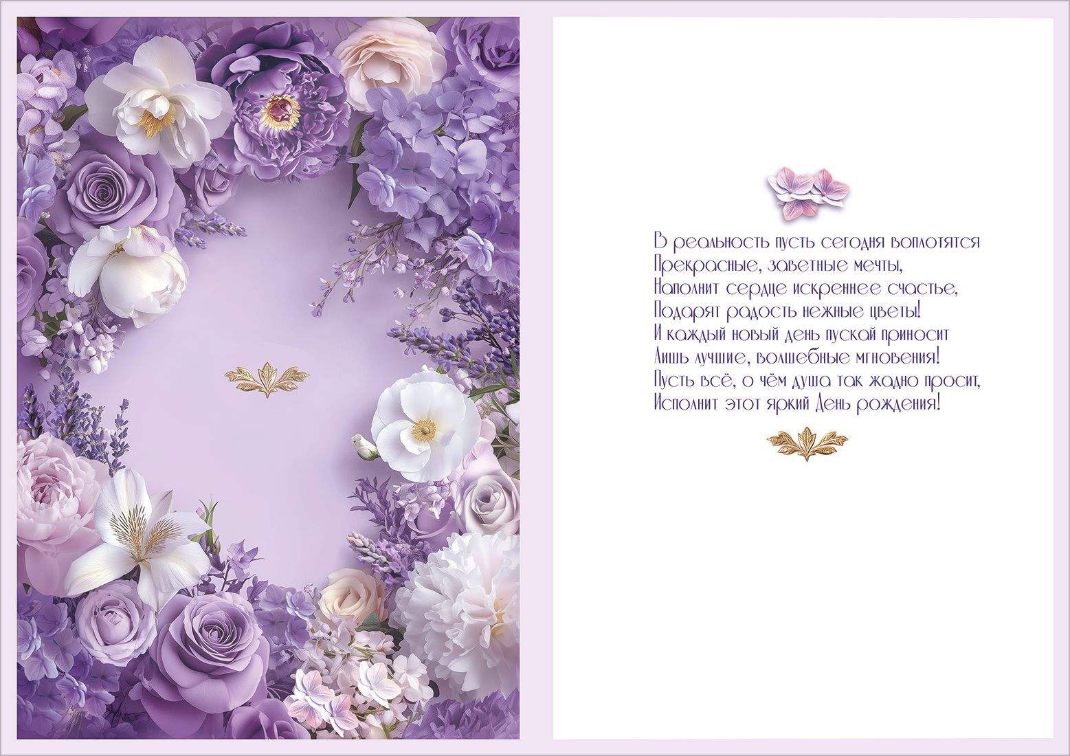 Открытка поздравительная формата А4 выполнена из плотного картона, что обеспечивает стабильную геометрию изделия при транспортировке, хранении и выкладке в торговом зале. Габариты готового изделия составляют 277 × 196 мм, формат удобен для размещения на стандартных стеллажах и в витринных дисплеях, а также для отправки в конвертах соответствующего размера. Открытка двусторонняя: лицевая сторона оформлена крупной композицией из декоративных цветов в фиолетово‑сиреневой гамме с акцентами белых и розовых бутонов, в центре расположен поздравительный текст «С ДНЁМ РОЖДЕНИЯ!» в контрастном золотистом исполнении. В отделке применены радужные блестки в лаке, создающие мерцающий эффект при изменении угла освещения; покрытие зафиксировано поверх печати, что снижает риск осыпания и истирания при частом контакте и многоразовой перекладке в торговых упаковках. Внутри предусмотрен готовый поздравительный текст, что сокращает время выбора для конечного покупателя и делает изделие удобным для розничных продаж в местах импульсного спроса. Картонная основа обладает достаточной жесткостью, открытка не деформируется при вертикальной выкладке и выдерживает стандартные условия складского хранения без потери внешнего вида. Поставляется по 10 штук, что упрощает планирование полочного запаса и формирование ассортимента по праздничной категории. Универсальный цветовой ряд и нейтральный по содержанию текст позволяют использовать открытку для поздравления взрослых адресатов разного возраста как в личных, так и в корпоративных ситуациях, включая вручение вместе с букетом, подарочной коробкой или сертификатом. Изображение и лаковая отделка устойчивы к выцветанию при кратковременном воздействии света в зале и не требуют специальных условий эксплуатации.