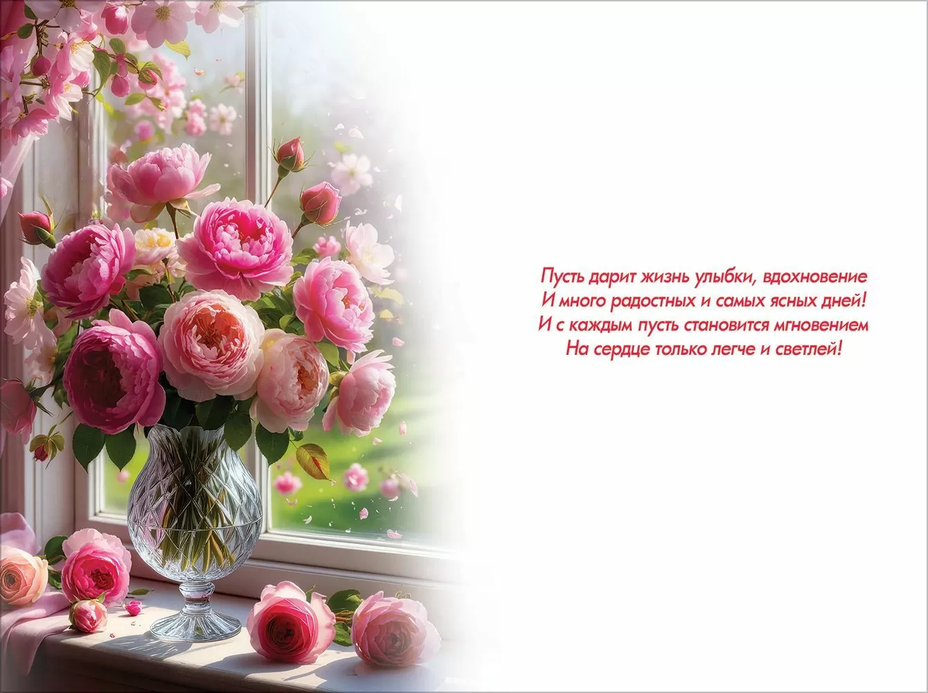 Открытка «С Днем рождения!» в формате А5 станет прекрасным дополнением к подарку и украсит праздник. Чудесный дизайн обязательно порадует каждую именинницу! Изделие украшено изображением летнего вида из окна, сквозь которое просматривается множество сочной зелени и яркого света. На подоконнике располагается стеклянная ваза с букетом воздушных розовых пионов. Этот элемент является центром всей композиции и притягивает взгляд. Возле вазы по подоконнику рассыпаны еще цветки, создавая тем самым художественный и нарочито небрежный вид. Внутри открытки – замечательные стихи с теплыми пожеланиями. Такой презент можно вручить в дополнение к основному подарку, чтобы украсить поздравление и сделать его более оригинальным. Изделие выполнено из качественных материалов, что обеспечивает ему прочность и долговечность, поэтому оно станет чудесным памятным сувениром для получателя.