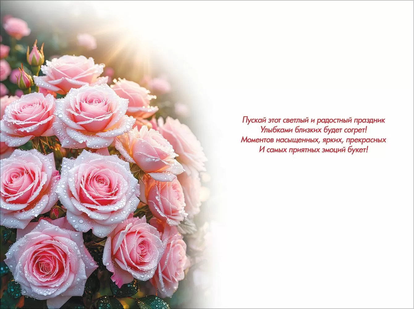 Открытка «С юбилеем!» в формате А5 станет прекрасным дополнением к подарку и украсит праздник. Волшебный дизайн обязательно порадует каждую именинницу! Изделие украшено изображением букета розовых роз с крупной россыпью капель росы на нежных лепестках. В верхней части открытки расположена поздравительная надпись на фоне яркого закатного солнца, символизирующего благополучие и процветание. Внутри открытки – замечательные стихи с теплыми пожеланиями. Такой презент можно вручить в дополнение к основному подарку, чтобы украсить поздравление и сделать его более оригинальным. Изделие выполнено из качественных материалов, что обеспечивает ему прочность и долговечность, поэтому оно станет чудесным памятным сувениром для получателя.