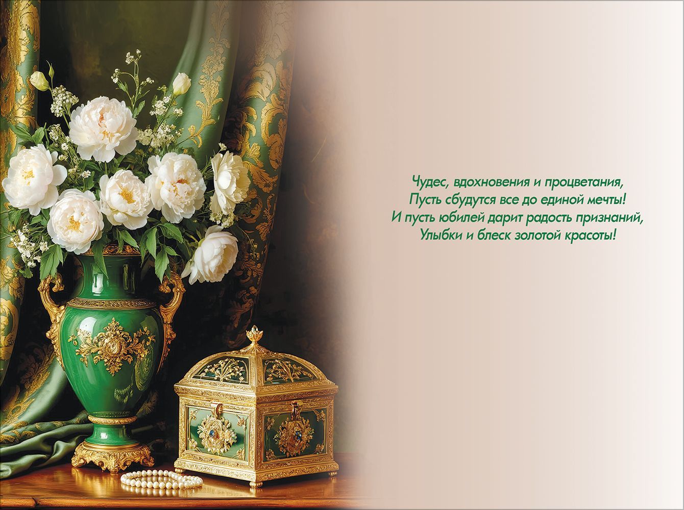 Открытка «С Юбилеем» (букет белых пионов в зелёной вазе, шкатулка, жемчуг)