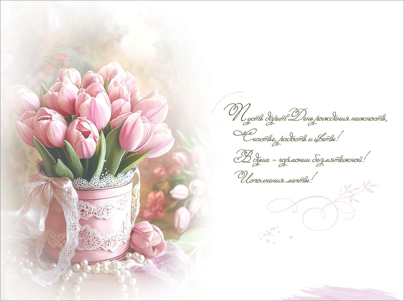 Открытка «С Днём рождения!» (букет розовых тюльпанов, жемчуг)