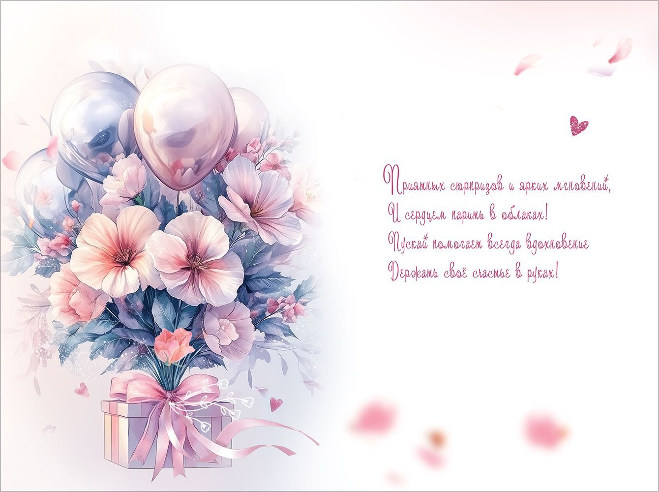 Открытка формата А5 предназначена для оформления поздравлений с днём рождения и ориентирована на использование в розничной продаже и оптовых поставках для магазинов подарков, канцелярии и цветочных салонов. Изделие изготовлено из плотного картона, обеспечивающего устойчивость к изгибам и истиранию при транспортировке и выкладке в торговом зале, а также сохранность формы при длительном хранении на складе. Лицевая сторона оформлена полноцветным изображением букета цветов и шаров в нежной пастельной гамме с надписью «С Днём рождения!», элементы композиции дополнены радужными блестками в лаке, за счёт чего создаётся аккуратный мерцающий эффект без осыпания покрытия и без заметного утолщения поверхности. Обратная сторона также печатная, с продолжением оформления и внутренним поздравительным текстом, что сокращает время на подготовку открытки к вручению и упрощает выбор для конечного покупателя. Габаритные размеры готового изделия составляют 182 мм в длину и 122 мм в ширину, что совместимо со стандартными конвертами соответствующего формата и удобно при размещении в витринах, настольных и настенных стойках. Картонная основа хорошо держит сгиб, не растрескивается по линии сгиба и подходит для нанесения дополнительных надписей шариковой ручкой или маркером без размазывания. Изображение устойчиво к выцветанию при обычных условиях эксплуатации, что важно при хранении партии товара на открытых стеллажах. Открытка поставляется в упаковке по 10 штук, что облегчает планирование закупок, формирование ассортимента по тематикам и контроль остатков. Нейтральный, универсальный дизайн с цветами и подарочной коробкой подходит для широкого круга получателей и может использоваться как самостоятельный элемент поздравления или в дополнение к подарку, цветочной композиции или подарочному набору.