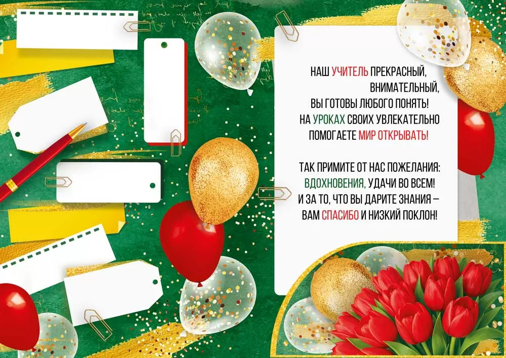 Открытка «Нашему учителю с благодарностью» в формате А4 станет прекрасным дополнением к любому подарку. Яркий дизайн изделия сделает любое поздравление незабываемым! Центром композиции является роскошный букет красных тюльпанов. Цветы перевязаны атласной лентой с поздравительной биркой. На фоне изображены конверт и разноцветные воздушные шары. Золотые вставки придают праздничности и торжественности. Внутри открытки – замечательные стихи с теплыми пожеланиями. Такой презент можно вручить в дополнение к основному подарку, чтобы украсить поздравление и сделать его более оригинальным. Изделие выполнено из качественных материалов, что обеспечивает ему прочность и долговечность, поэтому оно станет чудесным памятным сувениром для получателя.