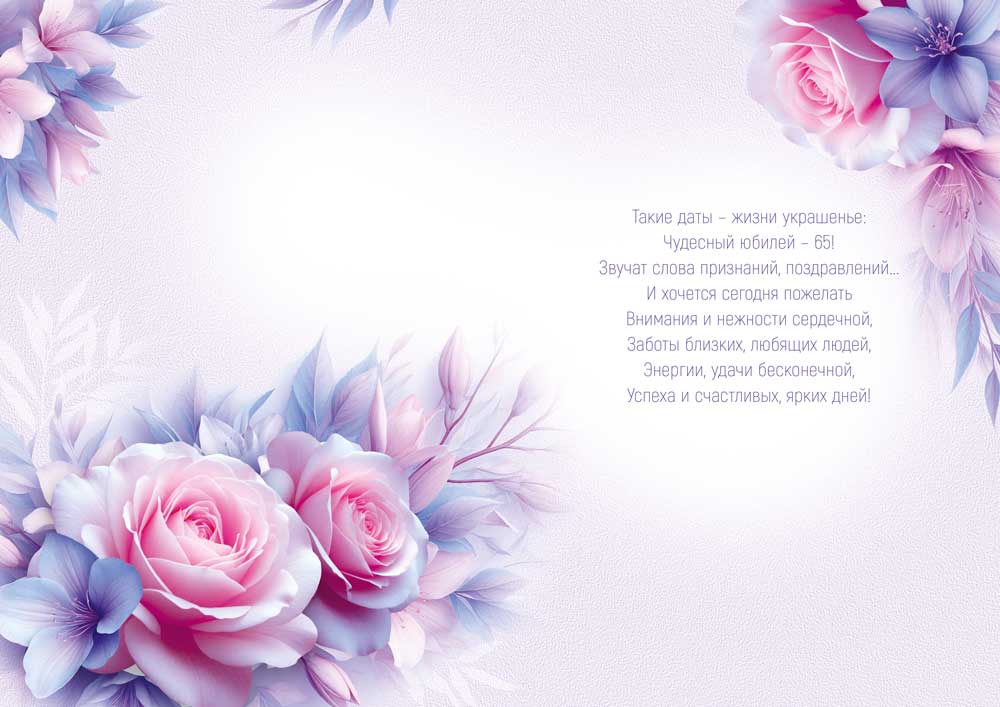 Открытка «С Юбилеем! 65 лет» в формате «А4» станет стильным и ярким дополнением к любому праздничному подарку, подчеркивая значимость этого знаменательного события. Дизайн открытки выполнен в нежных пастельных тонах с утонченной цветочной композицией. Пышные розовые и кремовые цветы, украшенные блестками в лаке, переливаются на фоне, придавая открытке праздничный и торжественный вид. Легкий фон с плавными переходами оттенков создает ощущение глубины и тепла, подчеркивая изысканность всего оформления. Внутри размещены трогательные стихи с тёплыми пожеланиями.