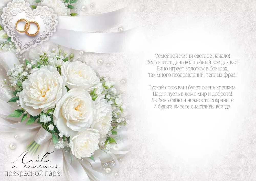 Открытка «С Днем свадьбы!» в формате «А4» станет идеальным дополнением к самому важному событию в жизни влюбленных. Дизайн выполнен в элегантных пастельных тонах с изысканной цветочной композицией. Белоснежные розы в сочетании с мелкими цветами и жемчужными акцентами создают атмосферу утонченности и праздника. Романтичные кольца, размещенные в декоративной сердцевидной рамке, дополняют общую концепцию, подчеркивая символику вечной любви и верности. Внутри — трогательные слова с пожеланиями любви и счастья, которые идеально подойдут для поздравления молодой пары в этот знаменательный день.