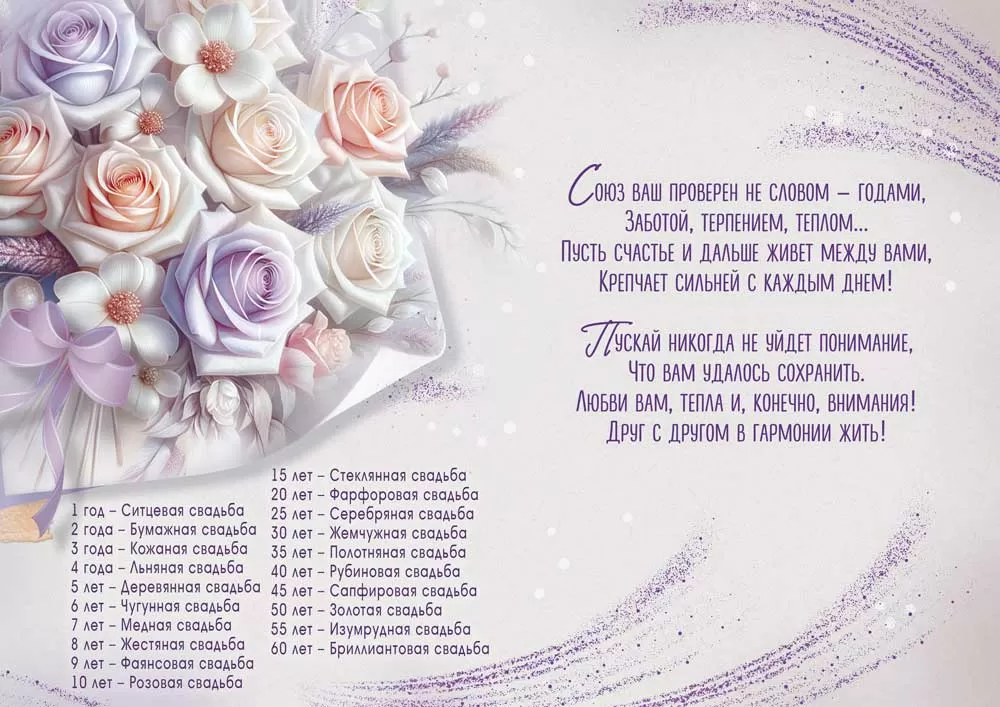 Открытка «С годовщиной Свадьбы! 25 лет» в формате «А4» станет отличным дополнением к поздравлению в этот знаменательный день. Дизайн открытки выполнен в нежных пастельных тонах с красивой цветочной композицией. Роскошные белые и сиреневые розы, а также другие изысканные цветы в мягких оттенках создают атмосферу элегантности и нежности. Вдохновляющая композиция украшена цветочными мотивами, что символизирует гармонию и любовь, а лента, перевязанная на кольцах, олицетворяет прочность и верность. Внутри — трогательные слова с пожеланиями любви и счастья, которые идеально подойдут для поздравления молодой пары в этот знаменательный день.