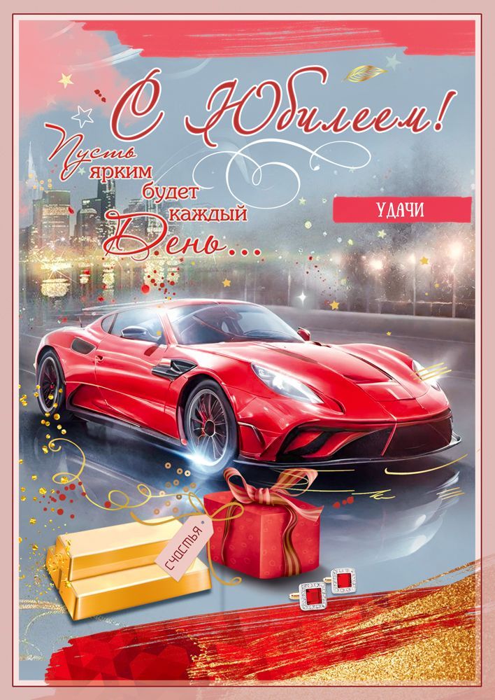 Открытка «С Юилеем! Пусть ярким будет каждый день... Удачи» (машина, слитки золота, подарок, запонки)