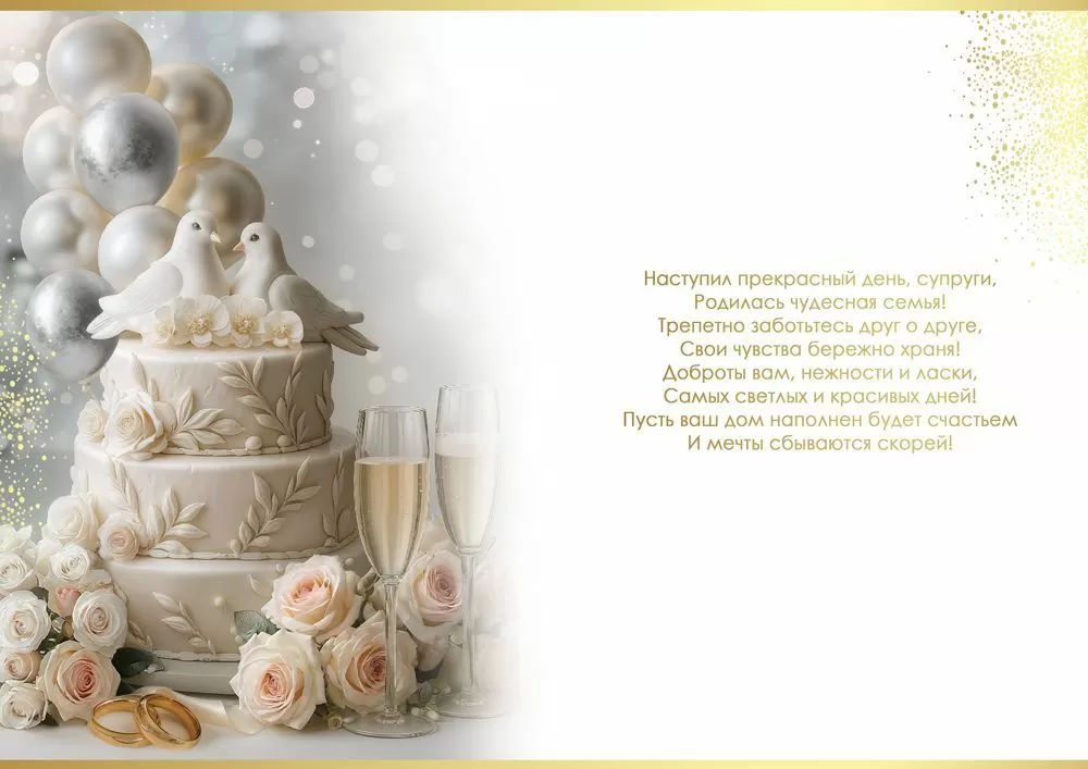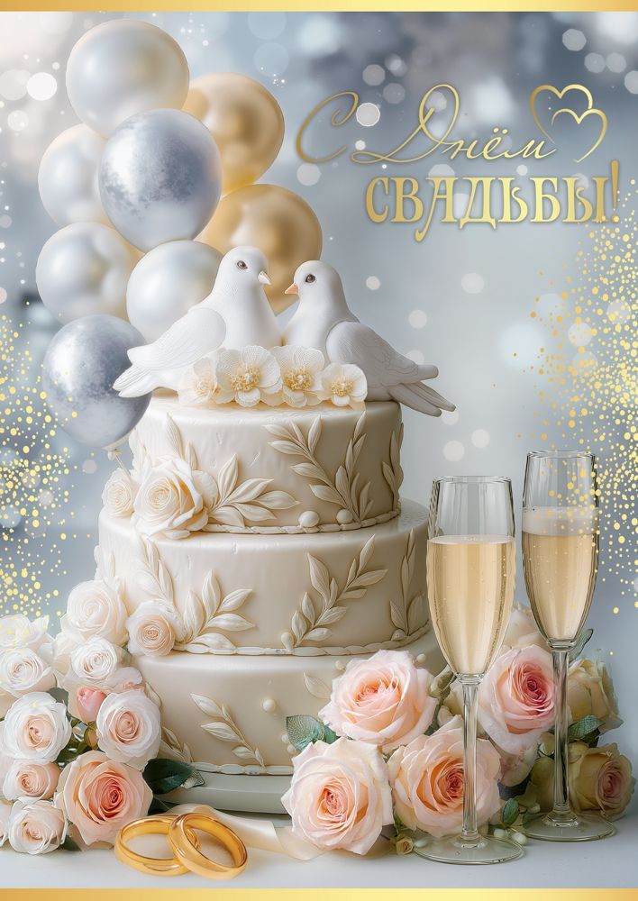 Открытка «С Днём Свадьбы!» (фигуры голубей на торте, воздушные шары, бокалы, розы, кольца)