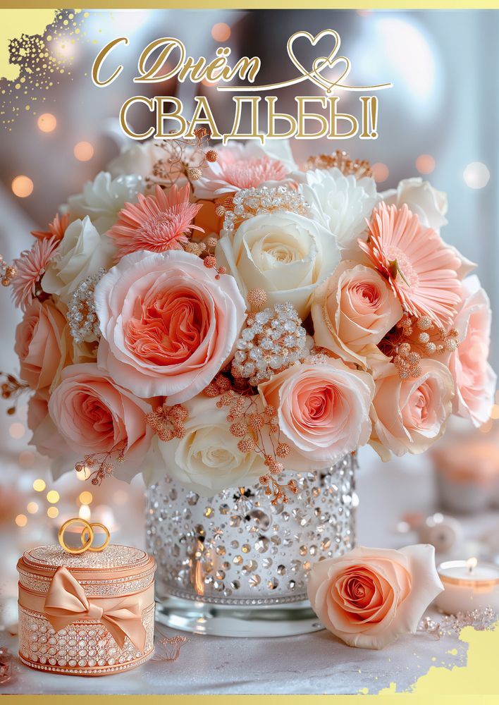 Открытка «С Днём Свадьбы!» (декоративный букет в вазе со стразами, шкатулка с бантом и кольцами)