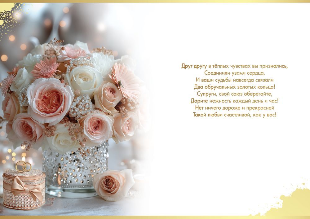 Открытка формата А4 «С Днём свадьбы» предназначена для оформления поздравлений в розничных и оптовых продажах, а также для использования в качестве дополнения к подарку или элементу праздничного декора. Изделие изготовлено из плотного картона, что обеспечивает стабильную форму, устойчивость к изгибам и сохранение внешнего вида при хранении и транспортировке крупными партиями. Лицевая сторона оформлена цветной печатью с детализированным изображением свадебной композиции из роз и декоративных элементов, дополненной акцентами блёсток в лаке золотого цвета; такая отделка устойчива к осыпанию при стандартной эксплуатации и не требует дополнительной защиты. Двустороннее изображение поддерживает единую стилистику оформления: лицевая сторона несёт основное поздравление «С Днём свадьбы!», внутренняя содержит заранее подготовленный текст, что сокращает время обслуживания покупателей в магазинах и упрощает выбор конечному пользователю. Габаритные размеры готового изделия — длина 277 мм и ширина 196 мм — позволяют размещать открытку в стандартных витринах, напольных и настольных стойках, а также использовать её как заметный акцент при выкладке сопутствующих товаров для торжества. Плотный картон совместим с большинством конвертов и упаковочных пакетов соответствующего формата, не деформируется при вертикальной установке на полке или в напольных кассетах. Открытка рассчитана на единичное и серийное применение в свадебной тематике, подходит для магазинов подарков, книжных сетей, цветочных салонов и интернет-площадок, где важна предсказуемость качества тиража и однородность партии. В упаковке 10.