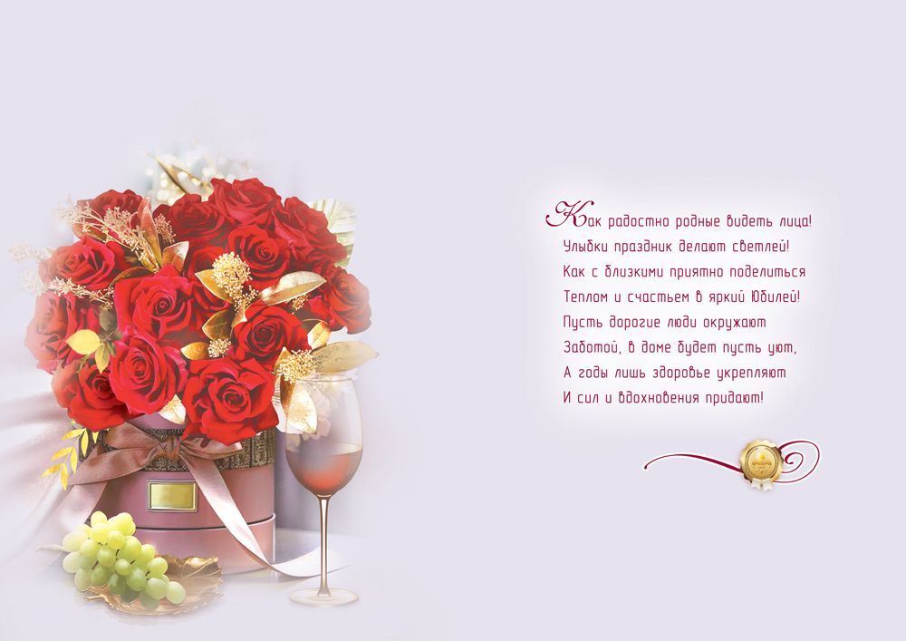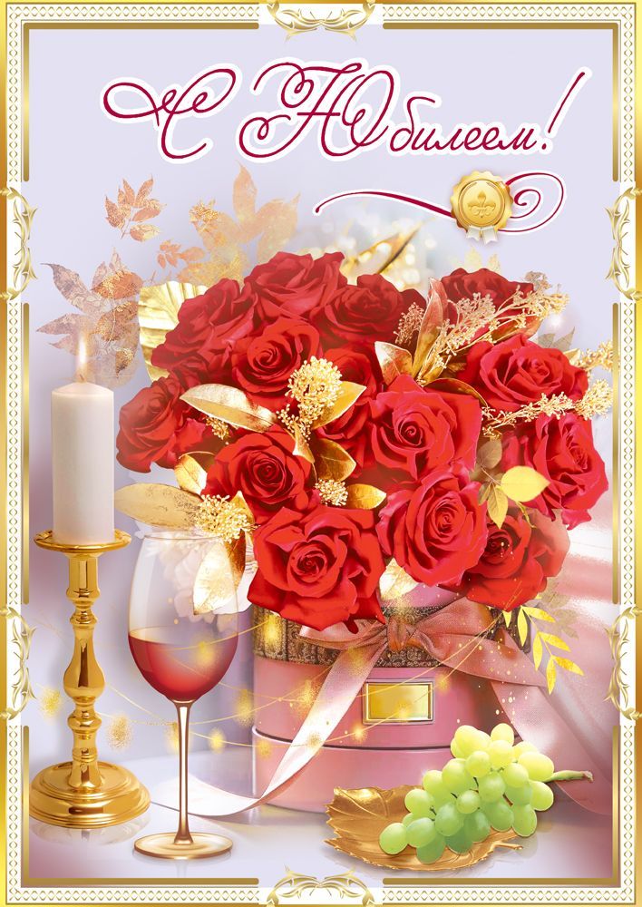 Открытка «С Юилеем!» (букет роз на коробке, свеча, бокал, виноград)