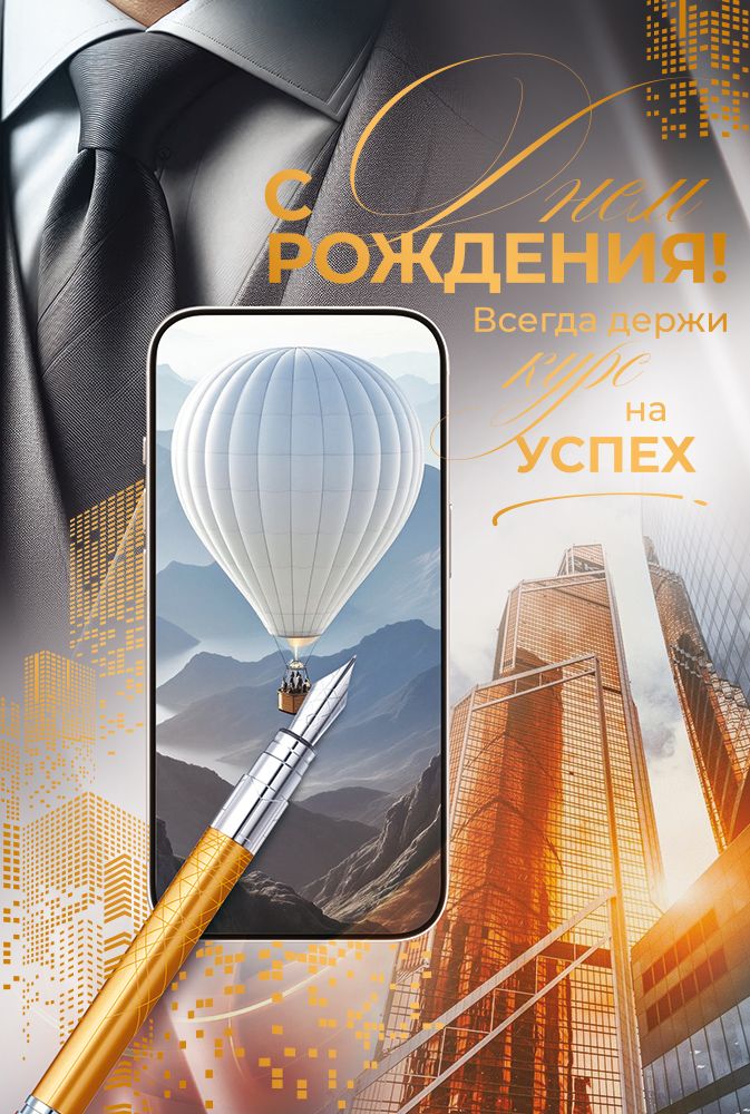 Поздравительная открытка среднего формата с надписью "С днем рождения!" и с дополнительным конвертом – идеальное решение для подарка или дополнения к подарку. Яркая иллюстрация дополнена золотой фольгой и непременно привлечет внимание. На открытке изображены мужчина в костюме, рубашке и галстуке, городские небоскребы и телефон, на экране которого в небеса поднимается воздушный шар. Внутри открытки есть поздравительное стихотворение. Изделие изготовлено из прочного материала, который хорошо держит форму. Благодаря высокому качеству печати и защитному покрытию краски не выцветут, и открытка на праздник будет радовать адресата многие годы. Размеры – 122х182. Открытка с конвертом упакована по 1 шт.