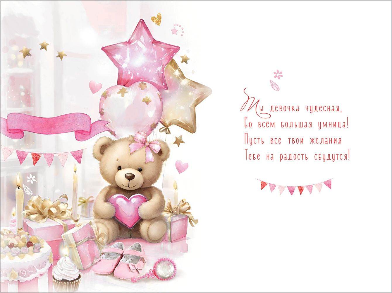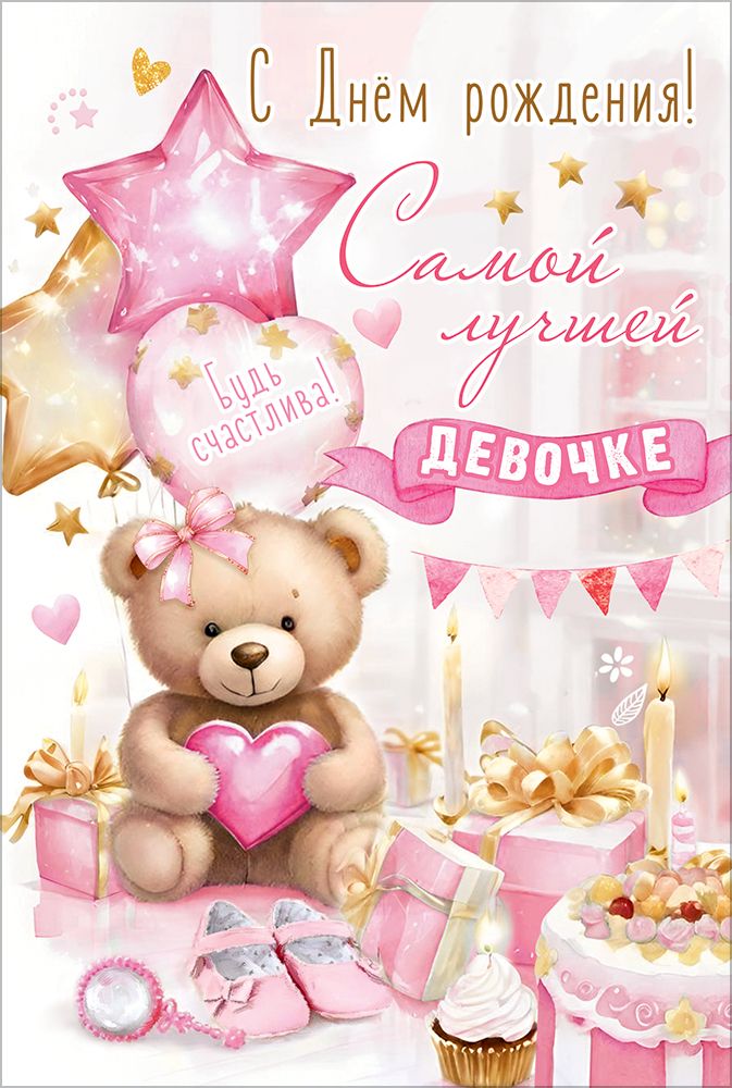 Открытка «С Днём рождения! Самой лучшей девочке. Будь счастлива!» (мишка с бантиком и сердечком в лапах, подарки, торт, свечки, гирлянда, шары, башмачки, пирожное, зеркальце)
