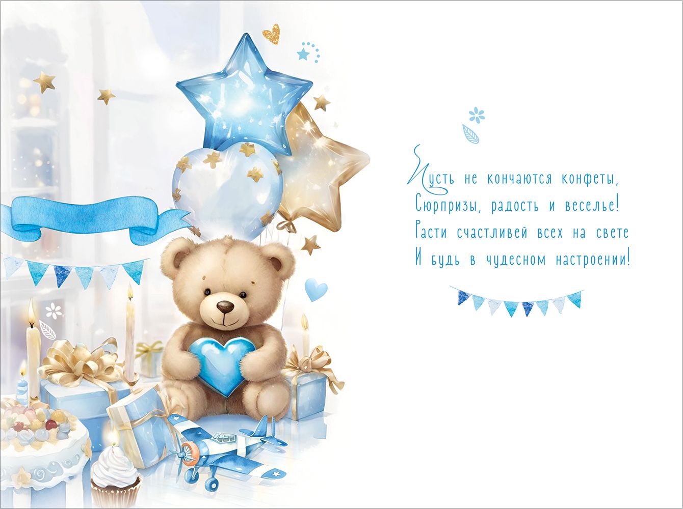 Открытка «С Днём рождения! Самому лучшему мальчику. Будь счастлив!» (мишка с сердечком в лапах, подарки, торт, свечи, шары, гирлянда, пирожное, самолётик)