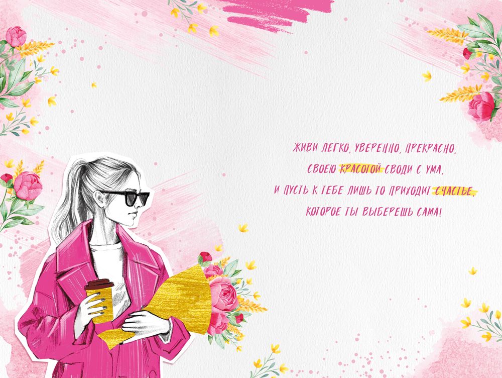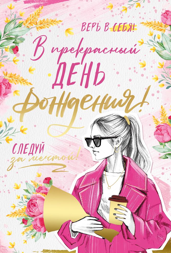 Открытка «В прекрасный День рождения!» (девушка с букетом)