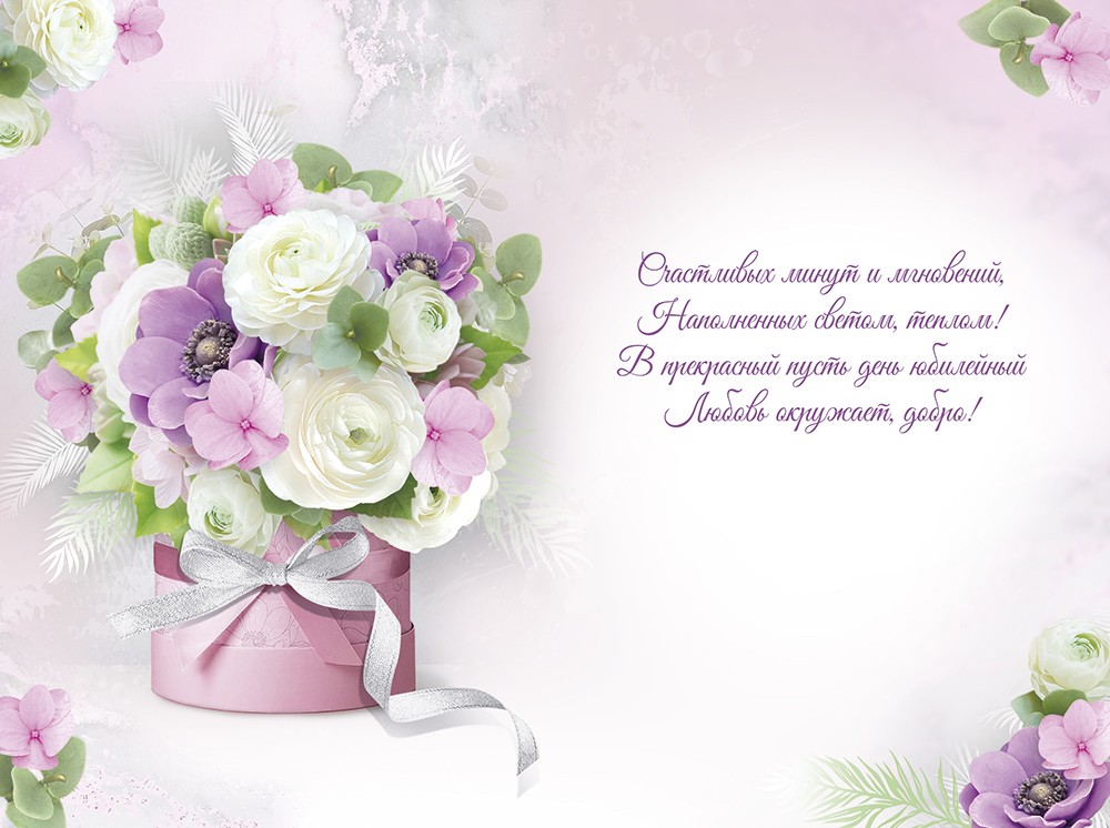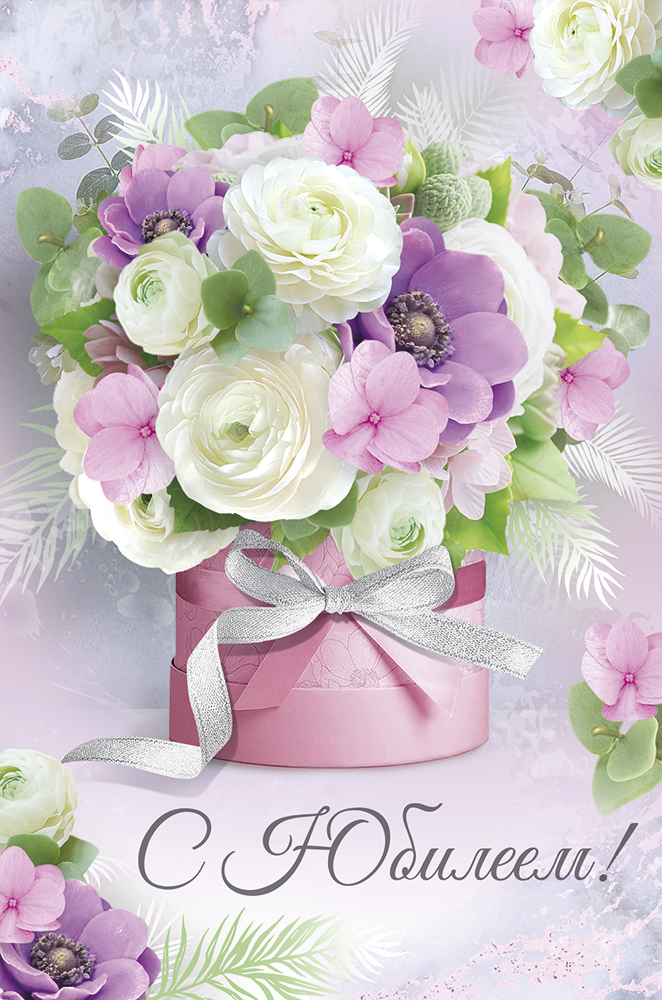 Поздравительная открытка "С Юбилеем!" с изображением красивых цветов! Женственная композиция и теплые слова — самое желанное поздравление!