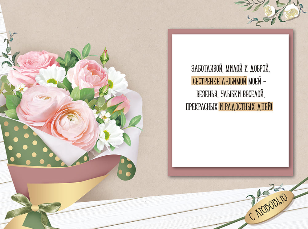 Поздравительная открытка "Сестренке!" с изображением красивых цветов! Женственная композиция и теплые слова — самое желанное поздравление!