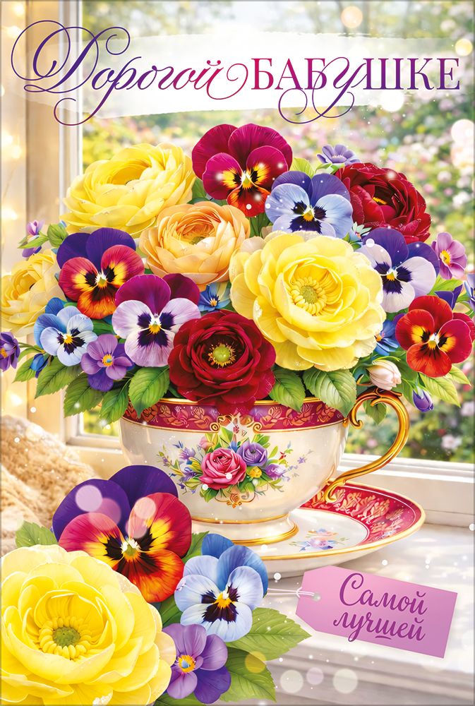 Поздравительная открытка среднего формата с надписью «Любиимой бабушке» – идеальное решение для подарка или дополнения к подарку! На открытке изображены бордовые и желтые розы и анютины глазки в чайной чашке с болюдцем и бирка с надписью "Самой лучшей". Внутри – поздравительное стихотворение. Изделие изготовлено из прочного материала, который хорошо держит форму и не помнется при транспортировке и использовании. Сверху на картонную основу нанесено четкое полноцветное изображение. Благодаря высокому качеству печати и защитному покрытию краски не выцветут, и открытка на праздник будет радовать адресата многие годы. Размеры – 122х182. В упаковке – 10 шт.