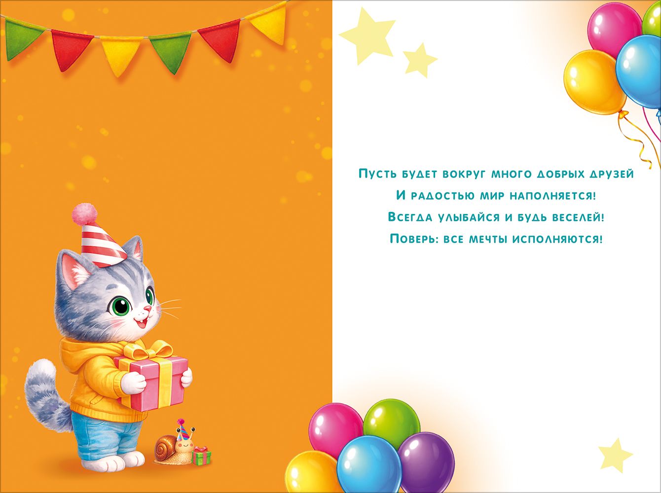 Поздравительная открытка среднего формата с надписью «С днем рождения!» – идеальное решение для подарка или дополнения к подарку! На открытке изображены три котика, которые держат в лапках коробки-подарки, аппетитный торт с горящими свечами и ягодами и множество разноцветных воздушных шаров. Внутри – поздравительное стихотворение. Изделие изготовлено из прочного материала, который хорошо держит форму и не помнется при транспортировке и использовании. Сверху на картонную основу нанесено четкое полноцветное изображение. Благодаря высокому качеству печати и защитному покрытию краски не выцветут, и открытка на праздник будет радовать адресата многие годы. Размеры – 122х182. В упаковке – 10 шт.
