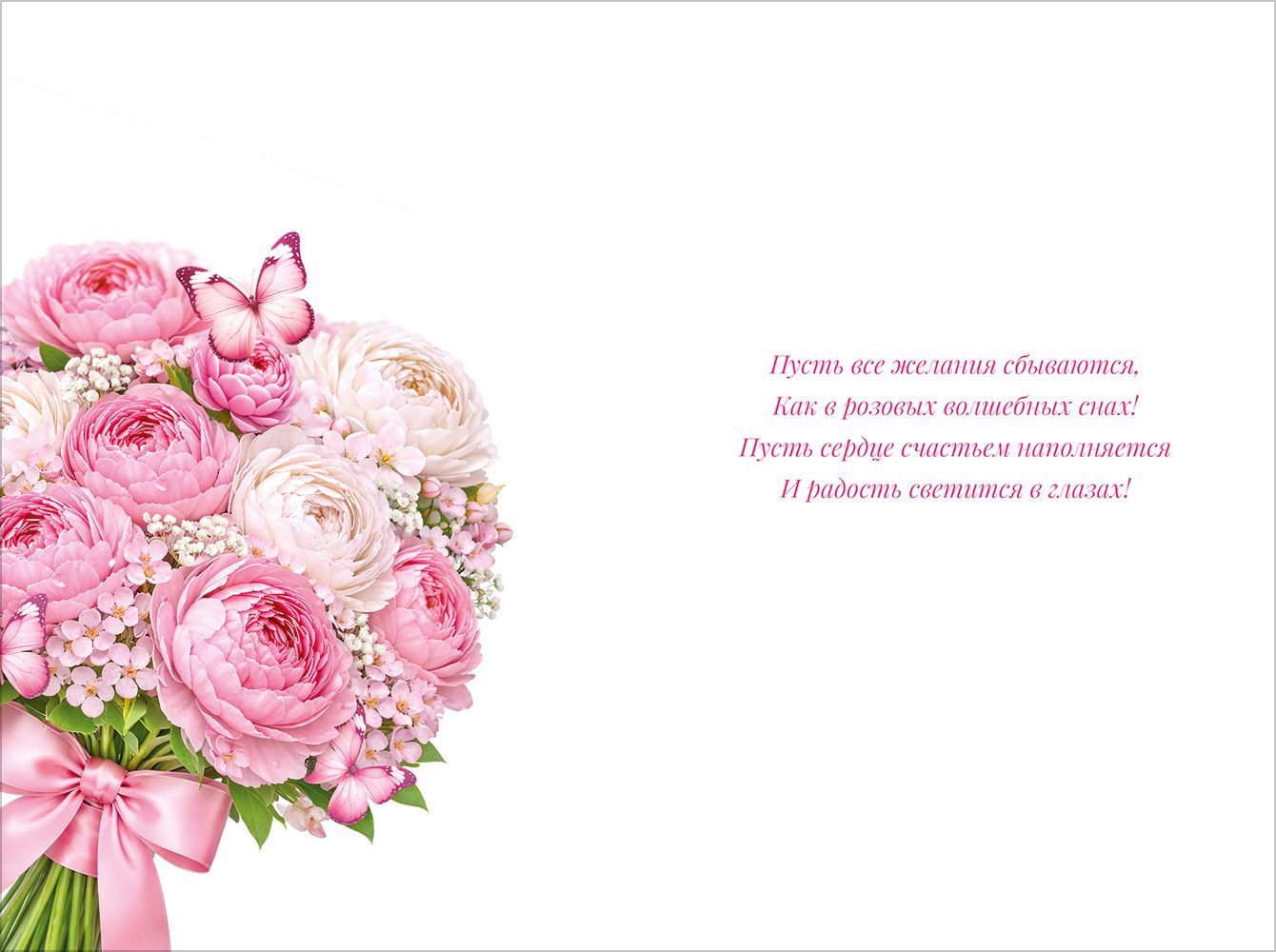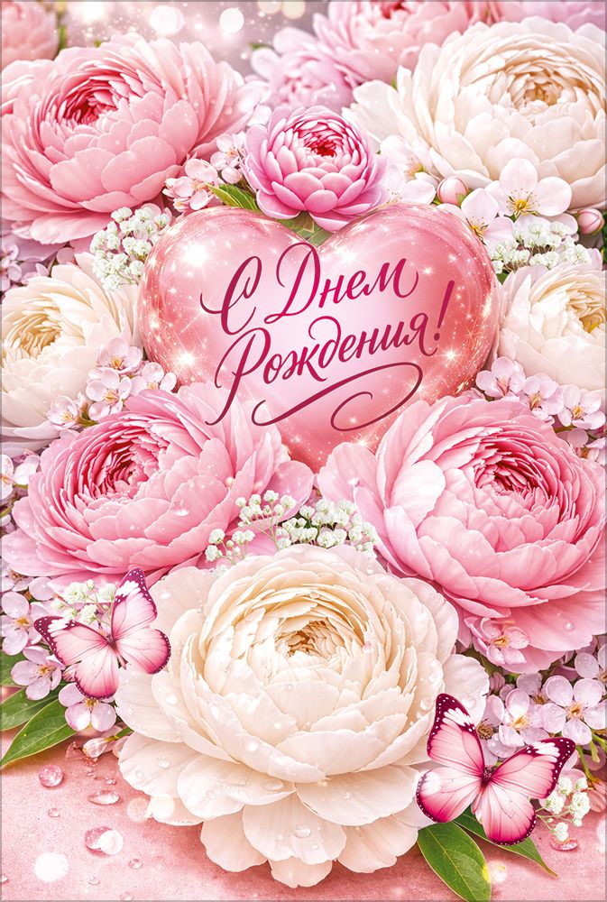 Поздравительная открытка среднего формата с надписью «С днем рождения!» – идеальное решение для подарка или дополнения к подарку! На открытке изображено множество крупных розовых роз, розовое сердце и бабочки. Внутри – поздравительное стихотворение. Изделие изготовлено из прочного материала, который хорошо держит форму и не помнется при транспортировке и использовании. Сверху на картонную основу нанесено четкое полноцветное изображение. Благодаря высокому качеству печати и защитному покрытию краски не выцветут, и открытка на праздник будет радовать адресата многие годы. Размеры – 122х182. В упаковке – 10 шт.