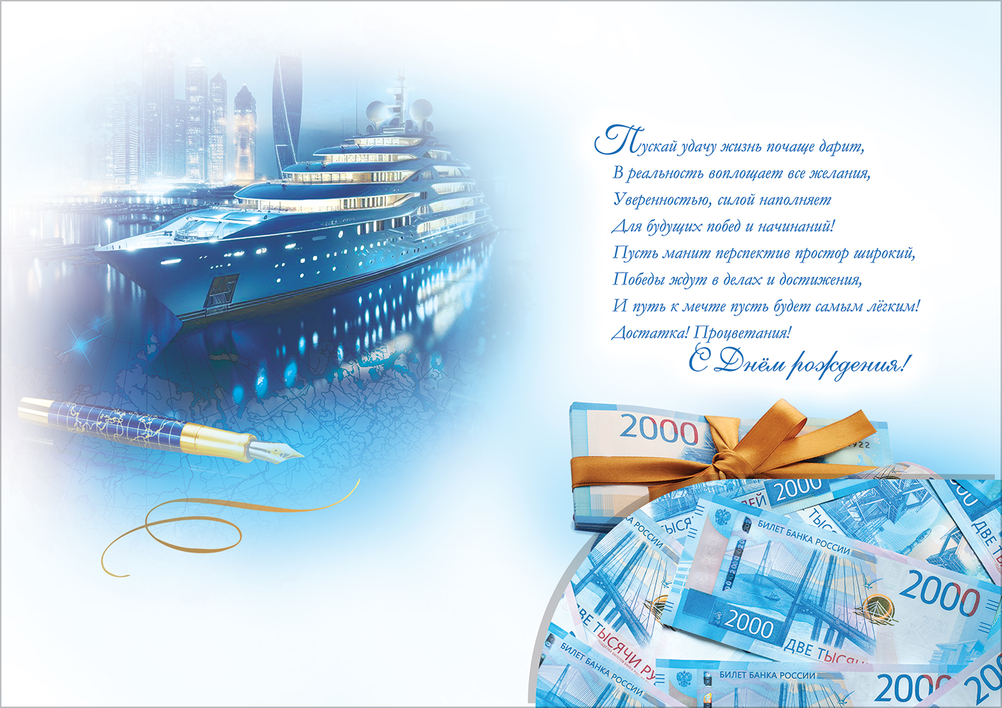 Открытка «В Днём рождения! Счастливой жизни» в формате А4 станет прекрасным дополнением к любому подарку. Необычный дизайн изделия сделает поздравление незабываемым! Яркий и праздничный сюжет никого не оставит равнодушным. В центре композиции – настоящий лайнер – символ достатка и роскоши. Он скользит по ровной водной глади насыщенного синего оттенка. На фоне тянутся ввысь небоскребы и сверкают салюты. На переднем плане изображены пачка купюр и золотая перьевая ручка. Эти атрибуты подчеркнут статусность такого подарка. Внутри открытки – замечательные стихи с теплыми пожеланиями. Такой презент можно вручить в дополнение к основному подарку, чтобы украсить поздравление и сделать его более оригинальным. Изделие выполнено из качественных материалов, что обеспечивает ему прочность и долговечность, поэтому оно станет чудесным памятным сувениром для получателя.