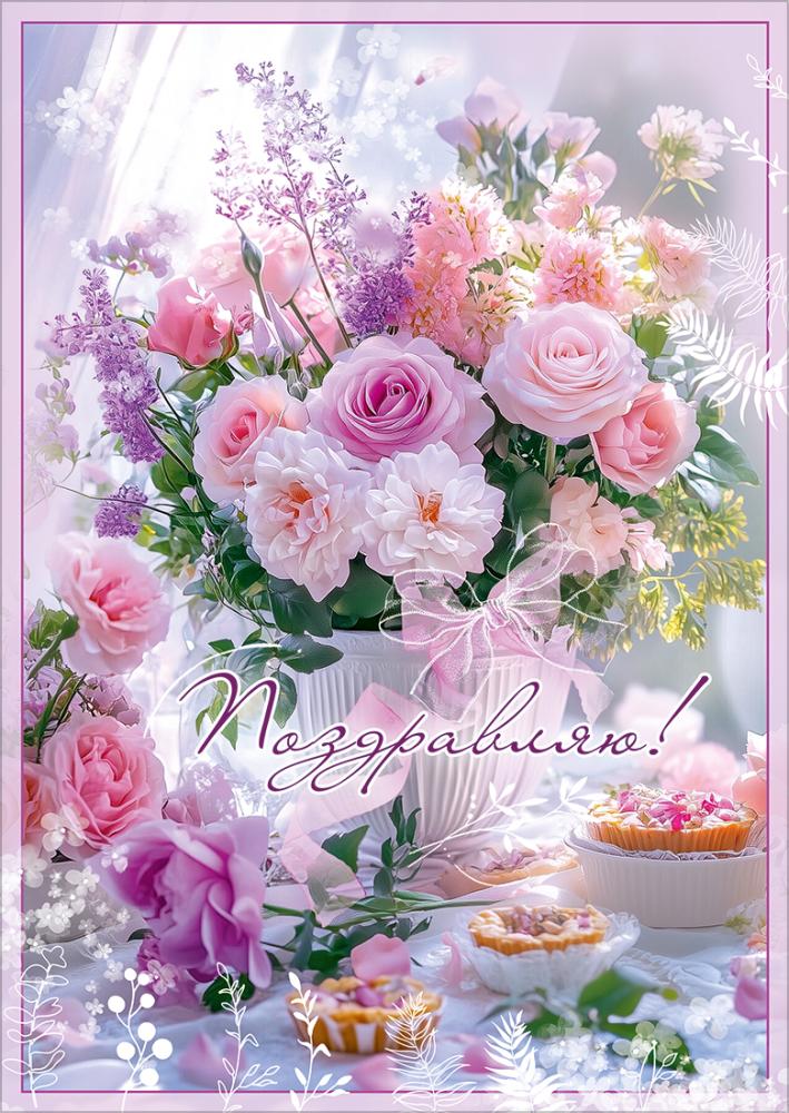 Открытка "Поздравляю!" (пышный букет из разных цветов в вазе с бантом рядом с пирожными)