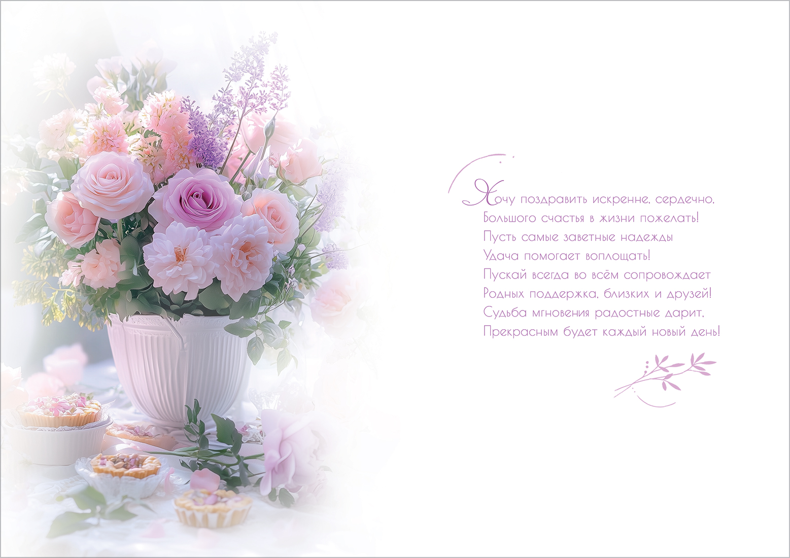 Дизайн открытки удачно сочетает современные художественные приёмы и классическую эстетику, благодаря чему она подойдёт для самых разных поводов. Внутри размещены трогательные стихи с добрыми пожеланиями. Открытка изготовлена из качественных материалов, отличается прочностью и аккуратным исполнением, поэтому может стать памятным сувениром на долгие годы.