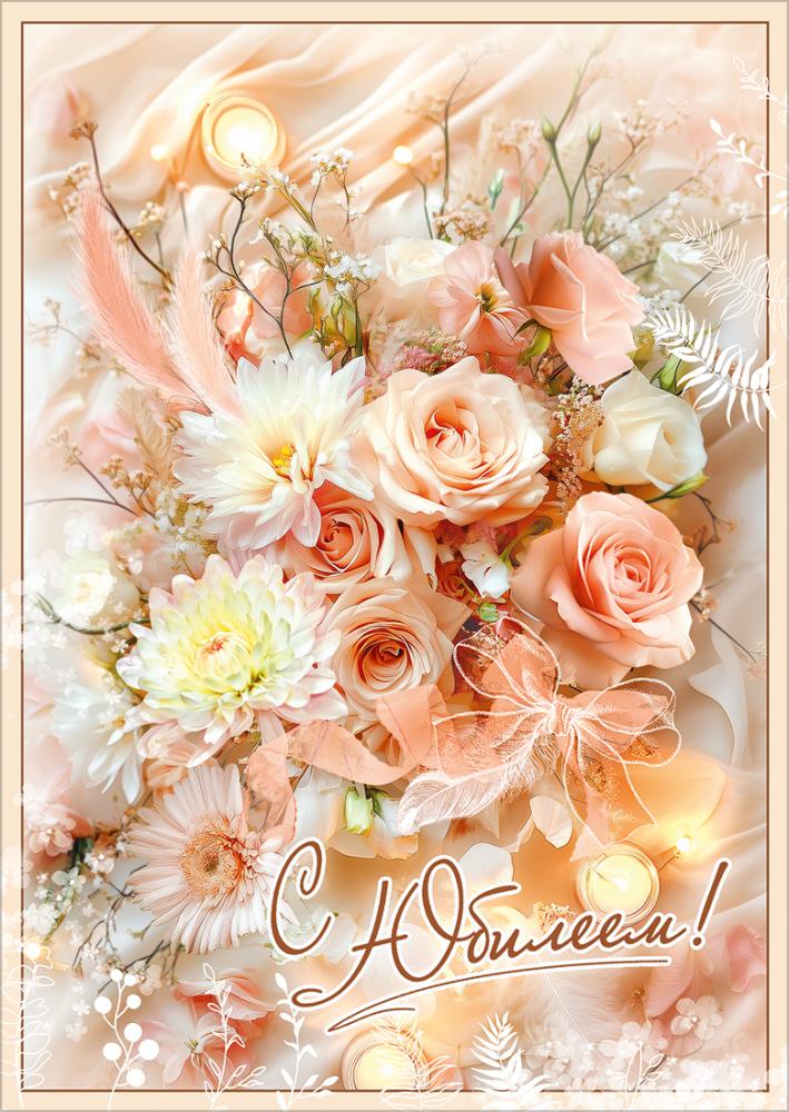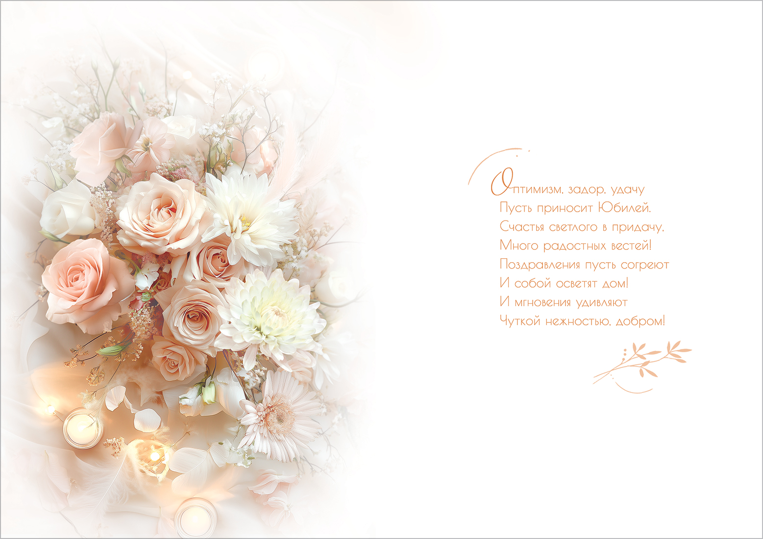 Открытка «С Юбилеем!» формата А4 — изысканное решение для торжественного и значимого поздравления. Центральным элементом дизайна является роскошный букет в нежных кремовых, пудровых и розовых тонах, выполненный с высокой детализацией. Цветочная композиция дополнена радужными блёстками в лаке, которые подчёркивают праздничный характер изделия и придают ему особый шарм.