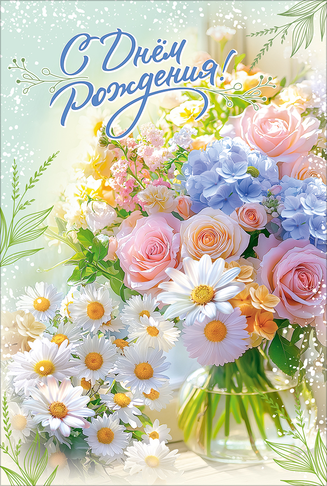 Открытка «С Днём рождения!» формата А5 оформлена в светлых, свежих тонах и украшена пышным букетом из роз и ромашек. Сочетание кремовых, розовых и нежно-голубых оттенков создаёт ощущение радости и праздничного настроения. Детализированная цветочная композиция выглядит объёмно и выразительно, подчёркивая торжественность момента.