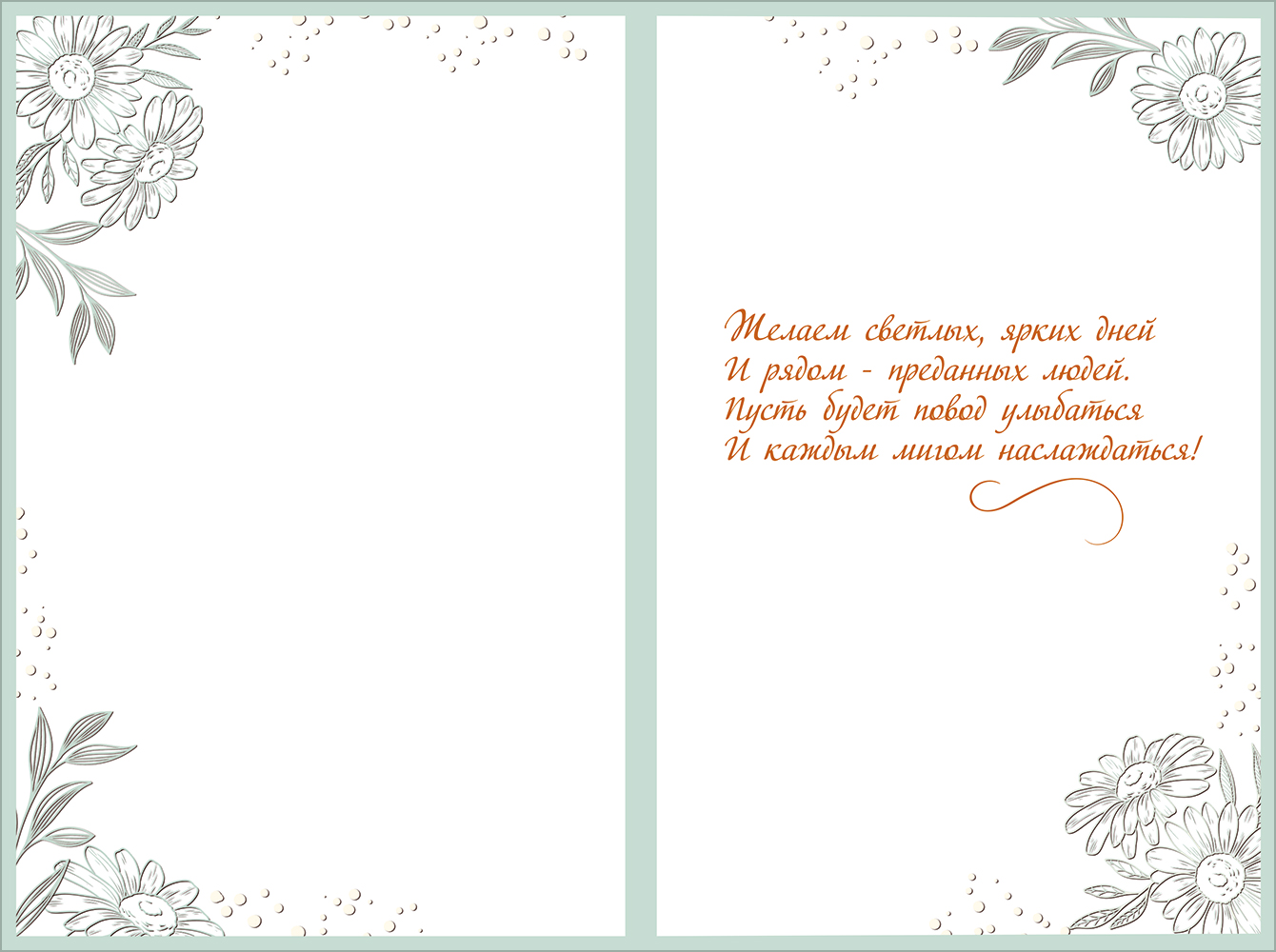 Внутри открытки — красивые стихи с универсальными пожеланиями, подходящими для разных поводов. Изделие выполнено из качественных материалов и отличается чёткостью печати, что гарантирует долговечность и презентабельный внешний вид.