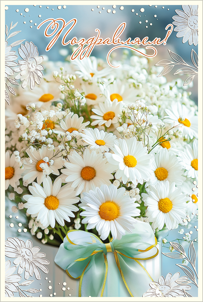 Открытка «Поздравляем!» формата А5 выполнена в классическом стиле с акцентом на нежные ромашки и светлую цветовую палитру. Бело-жёлтые цветы на фоне мягких серо-голубых оттенков создают ощущение чистоты, лёгкости и искренних эмоций. Декоративные элементы и аккуратные детали придают композиции завершённость и праздничный характер.