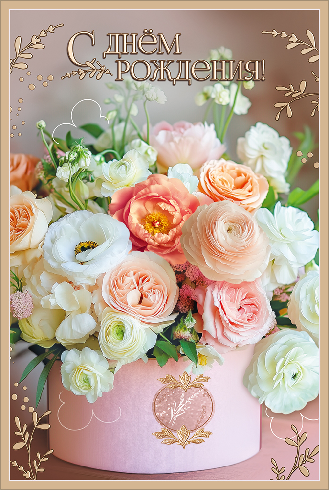 Открытка «С Днём рождения!» формата А5 станет стильным и современным дополнением к подарку. Дизайн украшен нежной композицией из роз и ранункулюсов в светлых кремово-розовых оттенках, размещённых в декоративной коробке. Гармоничное сочетание цветов и мягкий фон создают атмосферу уюта и утончённой элегантности.