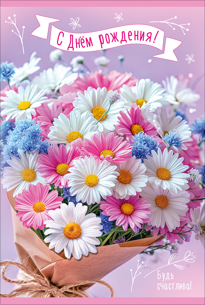 Открытка «С Днём рождения!» формата А5 выполнена в яркой и жизнерадостной цветовой гамме. Центральным элементом дизайна является пышный букет ромашек с розовыми и голубыми акцентами, который создаёт ощущение праздника и позитивных эмоций. Лёгкий декоративный фон подчёркивает объём композиции и делает изображение выразительным.