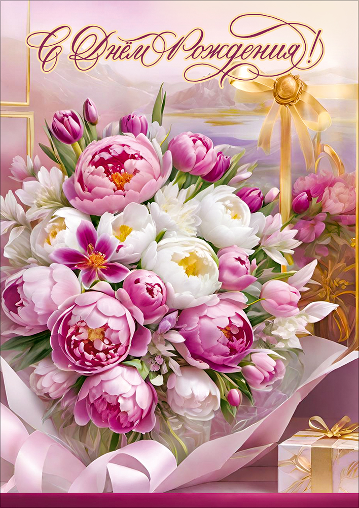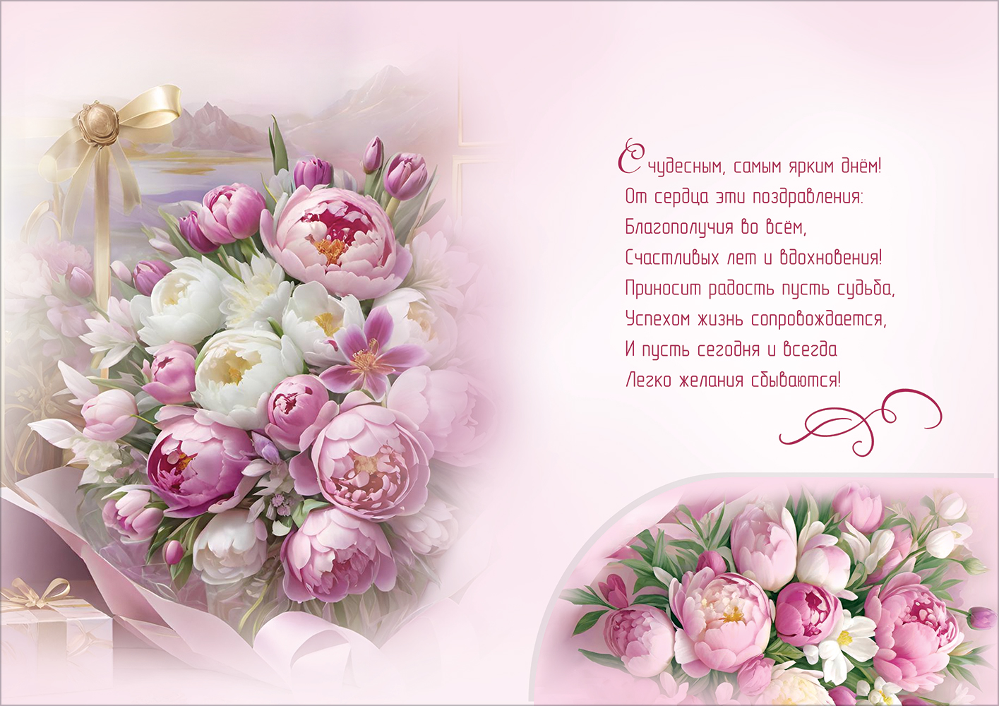 Открытка с карманом "С Днём рождения!" (букет пионов, подарок)