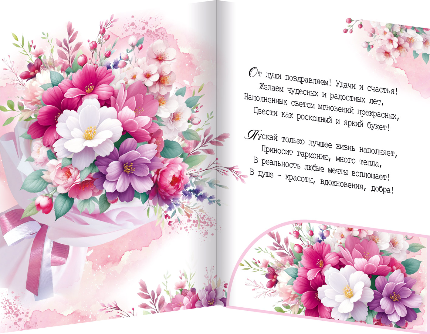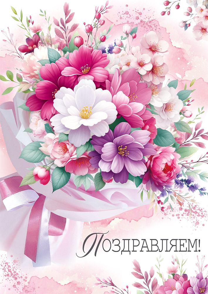 Открытка формата А4 предназначена для универсального поздравления и может использоваться в розничной продаже поштучно или как позиция для оптовых поставок в сезонных и постоянных ассортиментах. Основа изделия выполнена из плотного картона, обеспечивающего стабильную форму, устойчивость к изгибам и удобство хранения в стандартных витринных и складских лотках. Габаритные размеры готового изделия 277 × 196 мм позволяют размещать открытку в крупных подарочных пакетах и конвертах соответствующего формата, а также использовать её как самостоятельный элемент оформления подарка. На лицевой стороне размещено полноцветное изображение крупного букета цветов на светлом фоне с плавными розово-пастельными переходами, надпись «Поздравляем!» выполнена аккуратным шрифтом и хорошо читается с расстояния, что удобно при выкладке на стендах. Поверх основной печати нанесены радужные блестки в лаке, создающие умеренный декоративный эффект и дополнительную износостойкость изображения при транспортировке и частом контакте с руками. Внутри открытки предусмотрен печатный поздравительный текст, что снижает потребность в самостоятельном оформлении и делает изделие востребованным у покупателей, ищущих готовое решение. Конструкция дополнена карманом/клапаном для денег, что позволяет безопасно фиксировать купюры, подарочные сертификаты или небольшие плоские вложения; клапан рассчитан на стандартные размеры банкнот и не деформирует основное полотно при закрытии. Открытки упакованы по 10 штук, что удобно для формирования складских остатков, планирования полочного пространства и проведения тематических выкладок к праздничным датам. Изделие подходит для использования в цветочных салонах, книжных магазинах, супермаркетах, канцелярских отделах и сувенирных точках как универсальное поздравительное решение для дней рождения, юбилеев, профессиональных и календарных праздников.