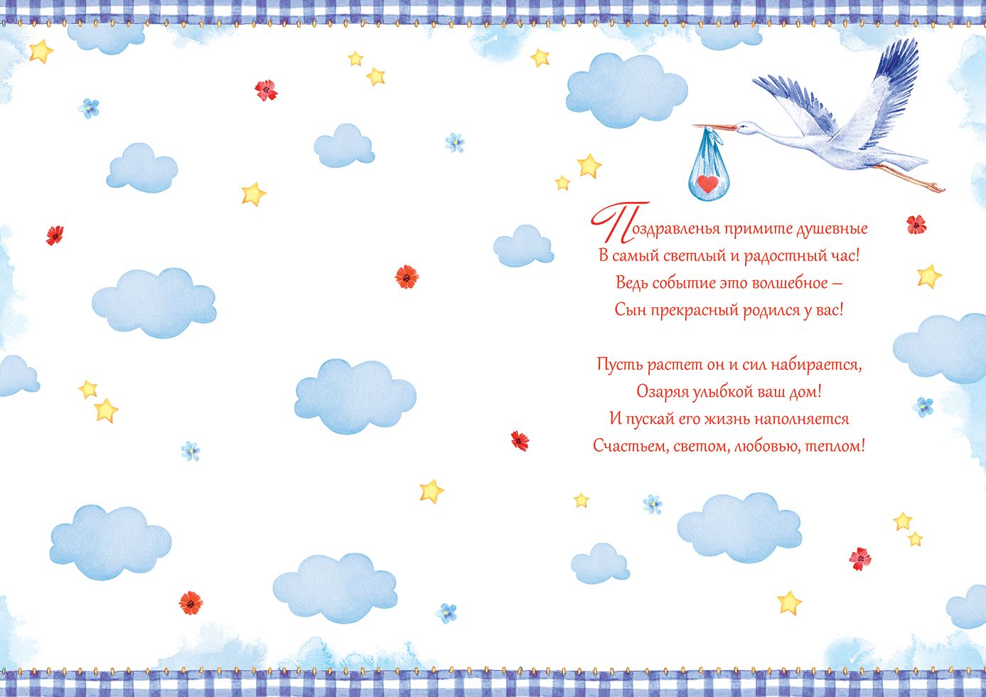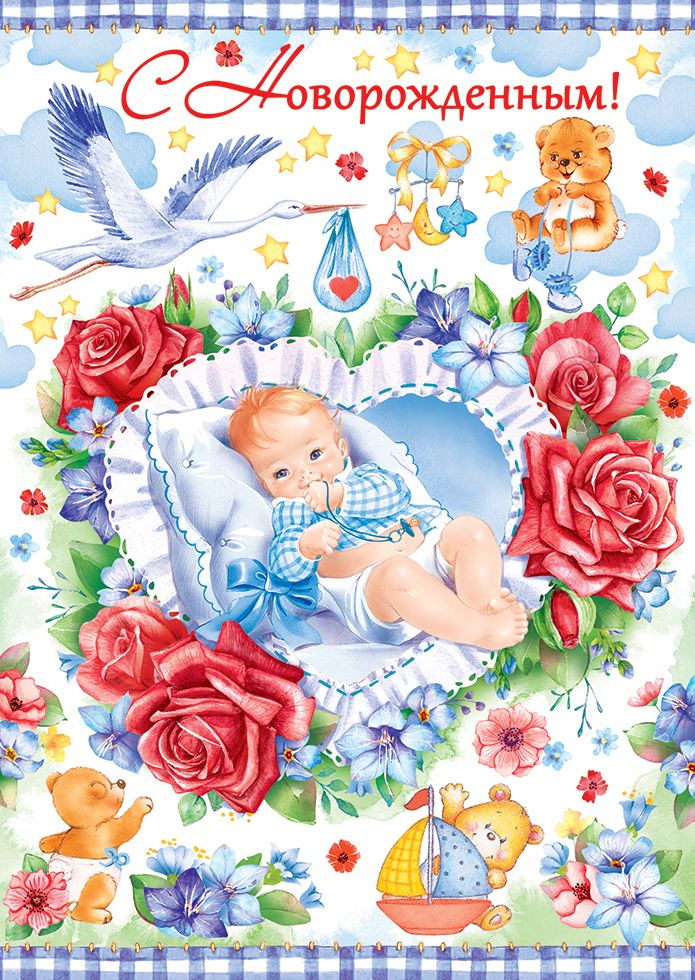 Открытка формата А4 предназначена для поздравления с рождением ребенка и ориентирована на использование в ассортименте магазинов подарочной и канцелярской продукции, а также в сервисах по оформлению праздников. Изделие изготовлено из плотного картона, что обеспечивает стабильную геометрию, устойчивость к изгибам и удобство выкладки на полке или в напольных и настенных дисплеях. Готовый размер открытки составляет 277×196 мм, что позволяет размещать ее в стандартных пакетах и конвертах соответствующего формата и оптимизировать хранение на стеллажах и в складских ячейках. На лицевой стороне размещена полноцветная иллюстрация с изображением младенца в окружении цветов, игрушек, аиста и декоративных элементов, а также текстовое поздравление «С новорожденным!», хорошо читаемое с расстояния и заметное при выкладке фронтальным рядом. Внутри предусмотрен готовый поздравительный текст, что сокращает время выбора и использования открытки конечным покупателем и делает изделие удобным для розничных точек с высокой оборачиваемостью товара. Поверхность оформлена радужными блестками в лаке, создающими световой акцент на отдельных фрагментах изображения; такая отделка устойчива к истиранию при аккуратной эксплуатации, не осыпается при стандартных условиях транспортировки и позволяет длительно сохранять товарный вид. Картонная основа хорошо держит сгиб, не растрескивается по линии сгиба, что важно при многократных примерках и демонстрации покупателям. Открытка подходит для продажи поштучно и для формирования расширенного ассортимента поздравительных товаров к выписке из роддома и семейным праздникам, совместима с большинством стандартных подарочных пакетов и комплектуется в упаковки по 10 штук, что удобно при оптовых закупках, планировании запасов и учете на складе.