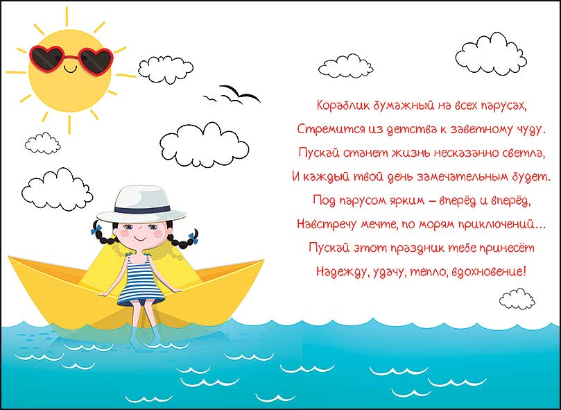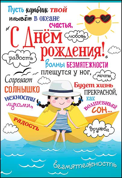 Открытка формата А5 выполнена из плотного картона и предназначена для поздравления с днём рождения, ориентирована на детскую и подростковую аудиторию. Лицевая сторона оформлена полноцветной печатью с иллюстрацией девочки в тельняшке на бумажном кораблике на фоне моря и солнца, дополненной крупной надписью «С Днём рождения!» и тематическими словесными облаками с пожеланиями радости, дружбы, любви и безмятежности. Внутри размещён заранее напечатанный текст поздравления, что сокращает время подготовки к вручению и удобно при массовых поздравлениях в детских коллективах, школах, кружках или при корпоративных акциях для семейных клиентов. Размеры готового изделия 182 × 126 мм обеспечивают совместимость с распространёнными конвертами для формата А5 и удобство при выкладке на полке, в напольных и настольных дисплеях, кассовых зонах. Поверхность имеет выборочное нанесение УФ-лака и конгрева, за счёт чего отдельные элементы рисунка и надписей визуально и тактильно выделяются, создавая акцент на поздравительном тексте и усиливая износостойкость лицевой стороны при частых касаниях, транспортировке и хранении. Картонная основа сохраняет форму, не деформируется при стандартных условиях эксплуатации, подходит для почтовой пересылки в соответствующем конверте. Упаковка содержит 10 одинаковых открыток, что оптимально для оптовых закупок с равномерным распределением по сезонным и праздничным выкладкам, а также для формирования тематических наборов. Нейтральная по возрасту и полу морская тематика, яркая, но не агрессивная цветовая гамма и универсальный текст позволяют использовать открытку как в розничных продажах поштучно, так и в составе ассортимента подарочной продукции для дней рождения в детских садах, школах, лагерях и развивающих центрах.