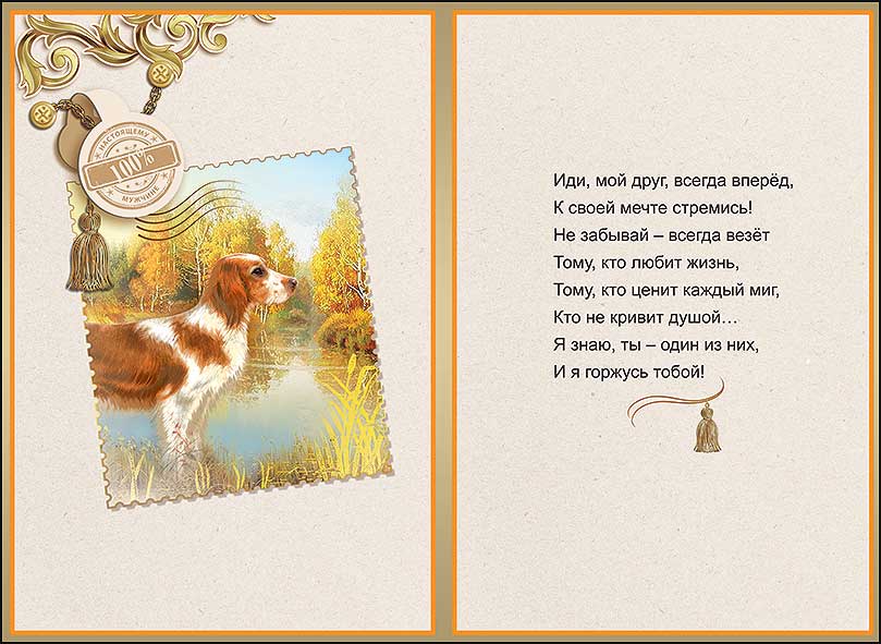 Открытка формата А5 выполнена из плотного картона, что обеспечивает стабильную геометрию изделия при хранении, транспортировке и выкладке в торговом зале. Готовый размер 182 × 126 мм позволяет размещать открытку в стандартных конвертах и на типовых витринах без дополнительной подрезки или подгибов. На лицевой стороне размещено полноцветное изображение собаки на фоне осеннего пейзажа с надписью «ДРУГУ» и дополнительными текстовыми акцентами, что делает изделие тематически ориентированным на поздравление близкого друга, коллеги или партнёра. Внутри предусмотрен готовый печатный текст, позволяющий использовать открытку без необходимости самостоятельного составления поздравления, что удобно для розничного покупателя и ускоряет выбор конечным клиентом. Печатное оформление выполнено офсетным способом с применением конгрева и золотой фольги, за счёт чего отдельные элементы надписей и декоративных деталей имеют рельеф и металлический блеск, повышающий визуальную выразительность и заметность товара на полке. Ламинированная поверхность не указана, поэтому при проектировании выкладки и хранении рекомендуется учитывать картонную основу и избегать длительного воздействия влаги. Открытка рассчитана на использование в качестве универсального поздравления ко дню рождения, профессиональному празднику или памятной дате, подходит для вручения как самостоятельно, так и в составе подарочного набора. Плотный картон сохраняет форму при пересылке в почтовом конверте, минимизируя риск деформации. Упаковка содержит 10 одинаковых экземпляров, что удобно для оптовых закупок, формирования однородной ассортиментной линейки и планирования тиражей для сетевой розницы, сувенирных и книжных магазинов. Компактный формат и стандартная толщина позволяют рационально использовать складские стеллажи и транспортные короба, а унифицированный дизайн с нейтральным, но персонализируемым обращением «ДРУГУ» делает открытку пригодной для широкого круга получателей в различных возрастных и социальных группах.