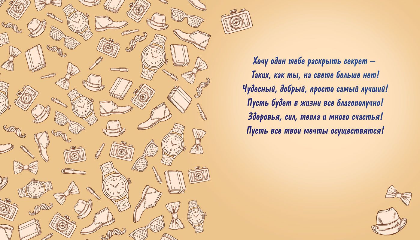 Открытка формата А6 «Дорогому дедушке» выполнена из плотного картона и предназначена для оформления поздравлений к дню рождения, юбилею и другим семейным событиям. Готовое изделие имеет размеры 158 × 138 мм, что обеспечивает достаточную площадь для восприятия оформления при компактном формате, удобном для хранения и транспортировки в стандартных коробах и почтовых отправлениях. Фигурная вырубка по контуру лицевой части придает изделию законченный вид и не требует дополнительной обработки при выкладке в торговом зале. Лицевая сторона оформлена в мужской тематике с фоновыми графическими элементами (аксессуары, часы, обувь), центральной панелью с надписью «Дорогому дедушке» и текстовыми вставками с готовыми поздравлениями. Используется отделка золотой фольгой, которая выделяет отдельные элементы дизайна и повышает износостойкость печати за счет дополнительного защитного слоя. Конструктив открытки включает дополнительный декоративный элемент на скотче, прочно зафиксированный на лицевой стороне; крепление рассчитано на стандартные механические нагрузки при транспортировке и многократном просмотре. Внутри расположен заранее напечатанный текст поздравления, что уменьшает время подготовки к вручению и удобно для розничного покупателя, при этом остается свободное место для личной подписи. Материал основы подобран с учетом стабильной геометрии: открытка не деформируется при вертикальной выкладке, сохраняет форму в стеллажах и напольных дисплеях, совместима с большинством стандартных пакетов и конвертов соответствующего формата. Изделие поставляется по 1 в упаковке, что позволяет формировать ассортимент точечно, без излишних остатков, а также гибко планировать выкладку по тематикам и адресатам. Открытка может использоваться как самостоятельный сувенир либо как дополнение к подарку, подходит для включения в ассортимент магазинов подарков, книжных сетей, киосков, интернет-магазинов и корпоративных закупок для поздравления сотрудников.