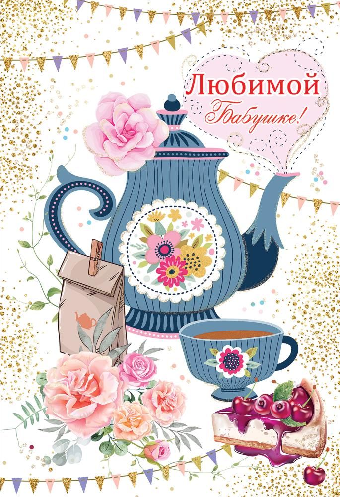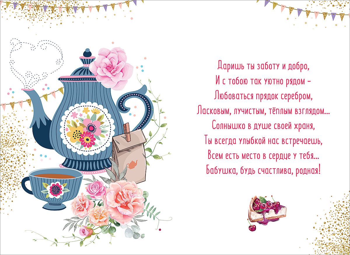 Открытка формата А5 предназначена для оформления поздравлений бабушке и ориентирована на использование в розничной продаже и оптовых поставках. Изделие изготовлено из плотного картона, что обеспечивает стабильную форму, устойчивость к деформации при хранении и транспортировке, а также аккуратный внешний вид при выкладке в торговом зале. Габаритные размеры готового изделия составляют 182 × 126 мм, что удобно для стандартных конвертов соответствующего формата и позволяет эффективно планировать полочное пространство и упаковку при оптовых закупках. Лицевая сторона оформлена цветной печатью с крупной композицией в чайной тематике: изображены чайник и чашка с декоративным орнаментом, цветочные элементы, десерт, гирлянды флажков и надпись «Любимой бабушке!», что делает открытку универсальной для поздравления с днем рождения, юбилеем, семейным праздником или любым другим торжественным событием. В отделке применены золотые блестки в лаке, создающие локальные акценты и повышающие износостойкость декоративных участков за счет защитного лаковогo слоя; такая технология хорошо переносит многократные касания, не осыпается и сохраняет презентабельный вид при длительном хранении на складе и в торговом обороте. Внутри размещен заранее напечатанный текст поздравления, что сокращает время подготовки к вручению и удобно для покупателей, предпочитающих готовые формулировки. Картонная основа подходит для стандартных шариковых, гелевых и капиллярных ручек, поэтому при необходимости можно дополнить печатный текст личными пожеланиями без риска растекания чернил. Открытка поставляется в упаковке по 10 штук, что облегчает учет, формирование заказов и пополнение ассортимента в магазинах подарков, книжных и канцелярских отделах, а также позволяет использовать ее как стабильную позицию в линейке праздничной продукции для семейной аудитории.