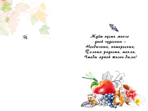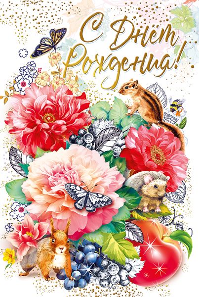 Открытка формата А5 предназначена для оформления поздравлений с днём рождения и может использоваться как отдельный поздравительный элемент или как дополнение к подарочной упаковке. Изделие изготовлено из плотного картона, что обеспечивает устойчивость к деформации при транспортировке, хранении и эксплуатации в торговом зале. Лицевая сторона оформлена полноцветной печатью с изображением крупных цветочных композиций, декоративных ягод и мелких животных, дополненных графическими элементами и фоном со множеством мелких деталей, что делает дизайн универсальным для широкого круга получателей. Поздравительная надпись «С Днём Рождения!» выполнена крупным шрифтом, хорошо читается на расстоянии и акцентирована золотой фольгой, за счёт чего надпись визуально выделяется на витрине и в выкладке. Дополнительное декоративное оформление реализовано с применением выборочного УФ-лака, который подчёркивает отдельные фрагменты изображения, создаёт глянцевые акценты и повышает износостойкость печати в наиболее нагруженных зонах. Внутри предусмотрен готовый печатный текст поздравления, что сокращает время обслуживания клиентов в рознице и упрощает выбор для конечного покупателя. Размер готового изделия 182 × 122 мм обеспечивает совместимость с распространёнными форматами почтовых конвертов и стандартных подарочных пакетов, что удобно при формировании комплексного ассортимента. Плотный картонный материал сохраняет геометрию открытки при штабелировании и фасовке, подходит для хранения в напольных и настольных дисплеях, а также в подвесных торговых системах. Упаковка содержит 10 открыток, что оптимально для планирования полочного запаса, формирования витринных выкладок по тематике «День рождения» и пополнения ассортимента в магазинах различного формата, от киосков до сетевых торговых точек.