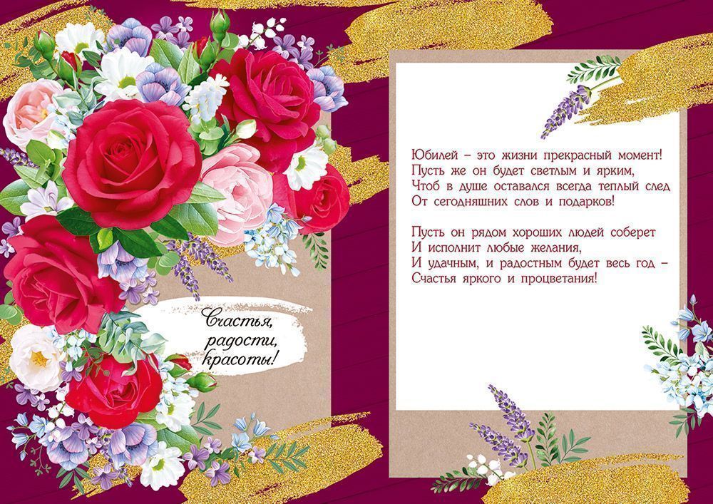 Открытка формата А4 предназначена для поздравления с юбилеем и ориентирована на использование в розничной продаже и оптовых поставках для магазинов подарочной продукции, книжных сетей и корпоративных закупок. Основа изделия выполнена из плотного картона, обеспечивающего стабильную геометрию и устойчивость к деформации при хранении и транспортировке крупными партиями. Габариты готового изделия составляют 277 × 196 мм, что позволяет использовать открытку как самостоятельный подарок или в комплекте с конвертом соответствующего формата. Лицевая сторона оформлена крупной цветочной композицией с изображением роз и полевых цветов на бордовом фоне с декоративными золотистыми элементами. Для отделки применены радужные блестки в составе лака, за счет чего отдельные фрагменты рисунка имеют выраженный глянцевый эффект и хорошо заметны при искусственном и дневном освещении, что важно при выкладке на витрине. Внутри открытки размещен готовый поздравительный текст с обращением к юбиляру, позволяющий использовать изделие без дополнительной доработки, что удобно для розничного покупателя и сокращает время обслуживания клиентов в торговой точке. Картонная основа совместима с большинством стандартных гелевых и шариковых ручек, что обеспечивает чистое нанесение подписи и личных пожеланий без размазывания. Открытка поставляется в упаковке по 10 штук, что упрощает учет и планирование закупок, формирование ассортимента по тематикам и сезонам, а также размещение на стеллажах и в прикассовой зоне. Изделие подходит для поздравления женщин и мужчин разных возрастов, может использоваться в личных, корпоративных и официальных поздравлениях, что делает позицию универсальной для включения в базовый ассортимент торговых предприятий.