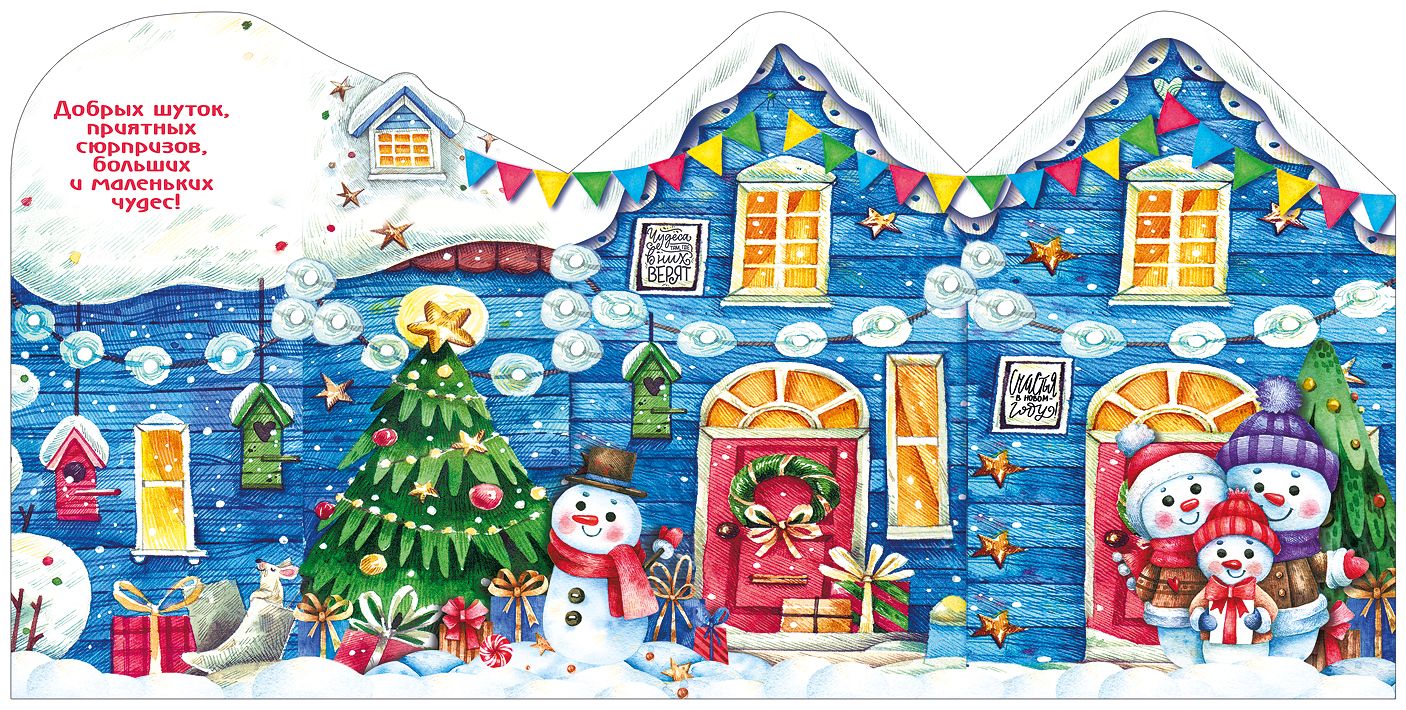 Открытка формата А5 выполнена из плотного картона с фигурной вырубкой по контуру иллюстрации, что придаёт изделию выразительную форму и облегчает визуальное позиционирование в новогоднем ассортименте. Готовое изделие имеет длину 182 мм и ширину 122 мм, размеры подобраны для стандартных витринных стоек и почтовых конвертов соответствующего формата, что удобно при оптовых поставках и последующей логистике. Лицевая сторона оформлена цветной новогодней композицией с изображением домика и семьи снеговиков на фоне зимнего пейзажа, что делает открытку универсальной для поздравления детей и взрослых, а также для использования в корпоративных новогодних рассылках. Поверхность дополнительно обработана выборочным УФ-лаком и конгревом, за счёт чего отдельные элементы рисунка и надписи имеют рельеф и глянцевый блеск, сохраняют устойчивость к истиранию и выцветанию при длительном хранении, выдерживают многократные тактильные контакты в торговом зале. Внутри размещён печатный поздравительный текст, позволяющий использовать открытку как готовое решение без необходимости дополнительного оформления, при этом остаётся свободное поле для личного обращения или подписи. Плотный картон сохраняет форму изделия при транспортировке крупными партиями, не деформируется при вертикальной выкладке и подходит для почтовой пересылки. Открытка поставляется по 1 штуке, что упрощает точный учёт остатков и формирование комбинированных выкладок и наборов. Такой формат удобен для розничной продажи поштучно, а также для формирования тематических новогодних коллекций в магазинах подарков, книжной и канцелярской рознице, на сезонных стендах и в корпоративных закупках для сотрудников и партнёров.