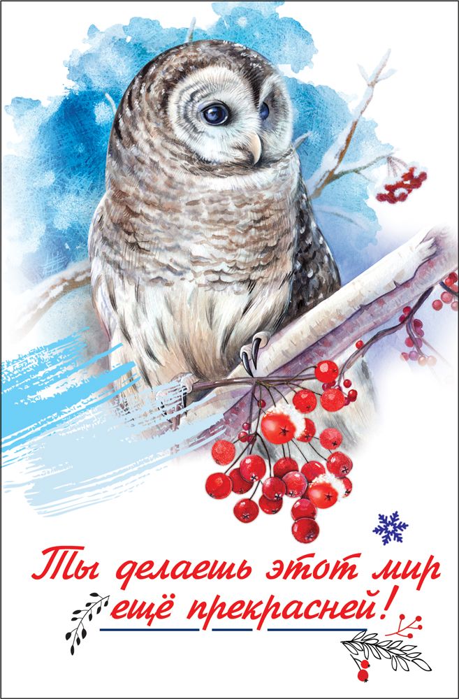 Открытка формата А6 изготовлена из плотной бумажной основы, обеспечивающей достаточную жёсткость для стабильной формы при хранении, транспортировке и выкладке в торговом зале. Габариты готового изделия составляют 146 × 96 мм, что удобно для стандартных почтовых конвертов и витринных стоек, а также позволяет рационально использовать складское пространство при оптовых поставках. Лицевая сторона оформлена полноцветным изображением совы на ветке с ягодами рябины на акварельном фоне, с акцентом на детализированную прорисовку пера и насыщенные красные и голубые оттенки. В нижней части размещён поздравительный текст: «Ты делаешь этот мир ещё прекрасней!», выполненный контрастным шрифтом, хорошо читаемым с расстояния, что важно при выборе открытки с полки. Внутри предусмотрен печатный текст, позволяющий использовать изделие как готовое решение для поздравления без необходимости полностью заполнять разворот вручную; при этом свободного места достаточно для краткого личного обращения, подписи и даты. Отделка без дополнительных декоративных элементов упрощает сортировку и упаковку, снижает риск повреждений при штабелировании и облегчает автоматизированный учёт. Бумажный материал совместим с большинством пишущих средств, включая шариковые и гелевые ручки, что удобно для розничного покупателя при оперативной подготовке поздравления в офисе, дома или в дороге. Нейтрально-позитивный характер надписи и зимний сюжет с совой и ягодами делают открытку универсальной для поздравлений коллег, партнёров, друзей и родственников в период зимних праздников, дней рождения и памятных дат. Компактный размер и стандартная прямоугольная форма позволяют использовать изделие как самостоятельный поздравительный элемент, вкладыш к подарку или дополнение к корпоративным подарочным наборам. В упаковке 10, что удобно для формирования оптового ассортимента, планирования тиражей под сезонный спрос и равномерного распределения по торговым точкам.