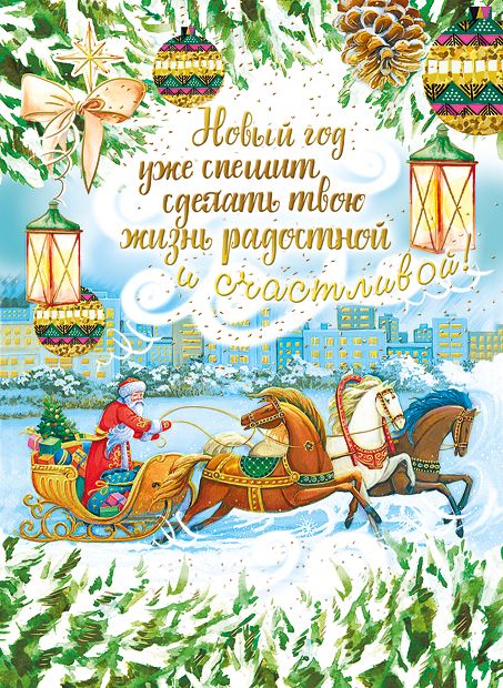 Открытка формата А6 предназначена для оформления новогодних поздравлений в розничном и корпоративном сегменте и оптимальна для оптовых закупок благодаря стандартным размерам 158 × 114 мм и стабильному качеству исполнения. Основой изделия служит плотный картон, обеспечивающий достаточную жесткость, устойчивость к деформации при транспортировке и хранении, а также аккуратный внешний вид при передаче получателю. Лицевая сторона оформлена полноцветной печатью с новогодним сюжетом: зимний городской пейзаж, тройка лошадей с санями и Дедом Морозом, еловые ветви, декоративные фонари и елочные украшения. В композицию встроен поздравительный текст «Новый год уже спешит сделать твою жизнь радостной и счастливой», который выполнен шрифтом с декоративной проработкой и дополнен золотой фольгой. Использование фольги придает надписи и отдельным элементам изображения выраженный блеск и повышает износостойкость лицевой поверхности за счет дополнительного защитного слоя. Внутри открытки предусмотрен печатный текст с новогодним поздравлением, оставляющий свободное поле для персональной подписи, что удобно при массовых поздравлениях сотрудников, клиентов или партнеров, а также при индивидуальном вручении в быту. Стандартный формат позволяет использовать открытку совместно с распространенными почтовыми конвертами и облегчает размещение на витрине, в напольных и настольных дисплеях, а также в подарочных наборах. Картонная основа хорошо переносит кратковременное механическое воздействие, не растрескивается при сгибе и сохраняет геометрию при вертикальном экспонировании. Упаковка рассчитана на 10, что упрощает учет при складских операциях, формировании заказов и планировании ассортимента к новогоднему сезону, а также позволяет быстро комплектовать партии для корпоративных рассылок и розничных продаж.